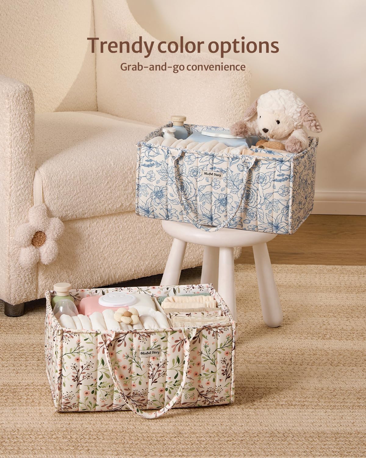 • Stylish Floral Diaper Caddy: Embrace a fresh, natural cottage style vibe with the daisy pattern in your nursery. It offers pastoral charm for sweet elegance. You can't help but be drawn to this floral basket neatness and refreshing every time you engage