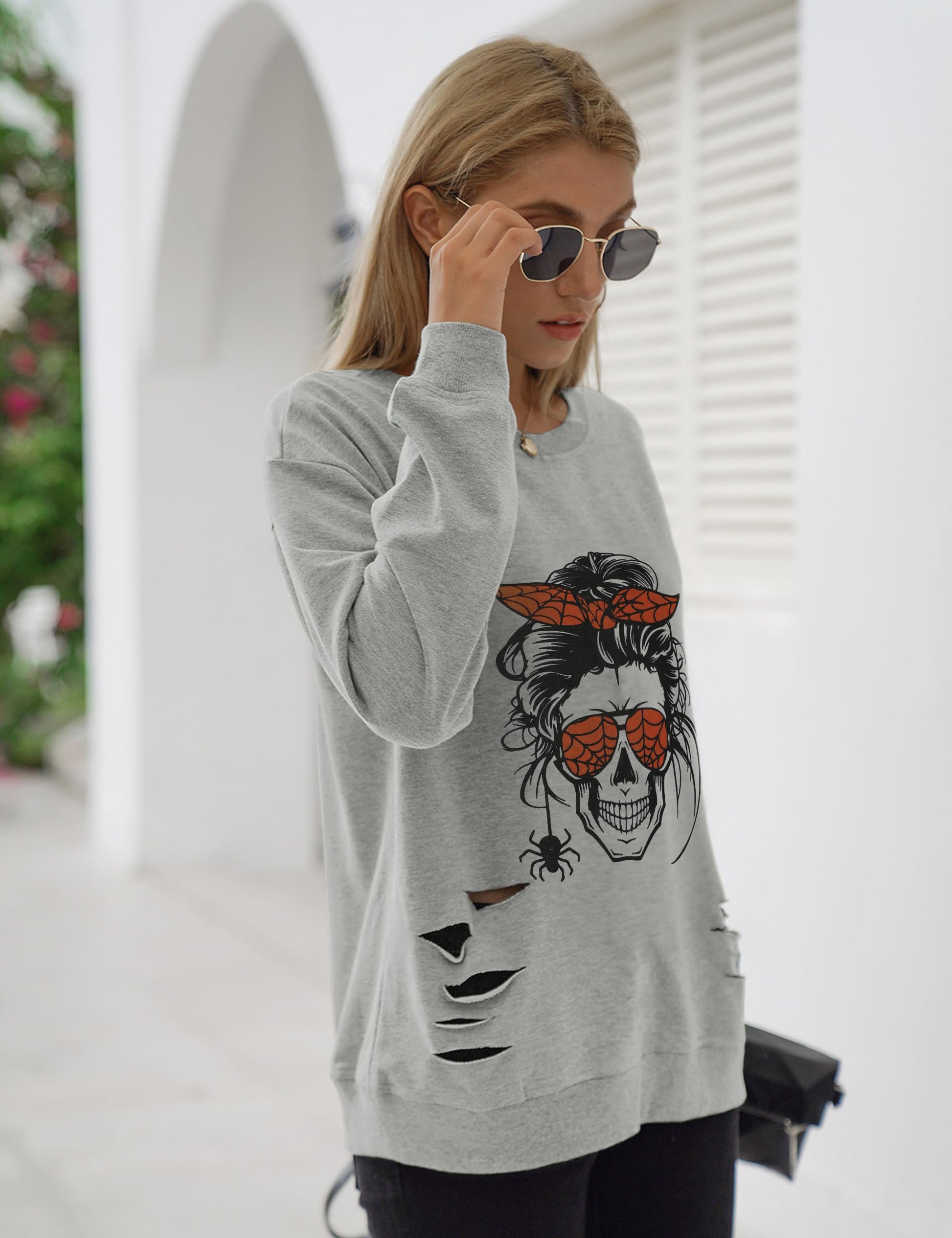 • Features: This halloween skull graphic sweatshirt features white skull or other different patterns on the center, loose-fitting design and hole design. The casual and slouchy street style makes you look like a cool girl.