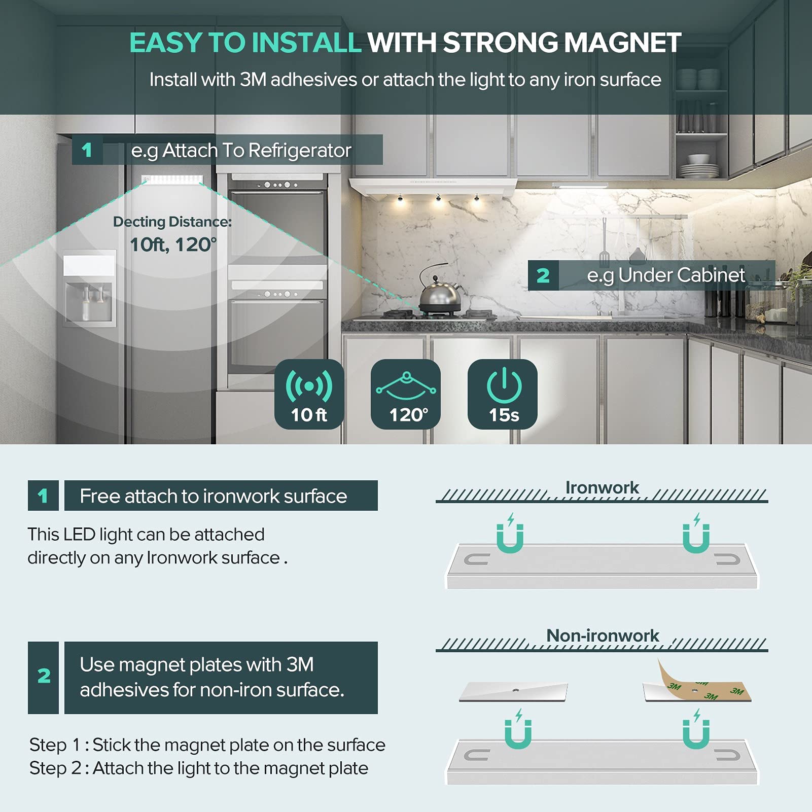 - CORDLESS INSTALLATION: The cabinet lights have built-in strong magnet, installation takes a few seconds with the provided 3M Sticker. Easily attached to and detachable from the magnet plate for charging. Premium quality 3M adhesives stick firmly, will not damage your furniture. This wardrobe light can be also be attached to any iron surface, eg. Refrigerator, shelf, storage rack, etc. No wires, tools, screws or nuts are required.