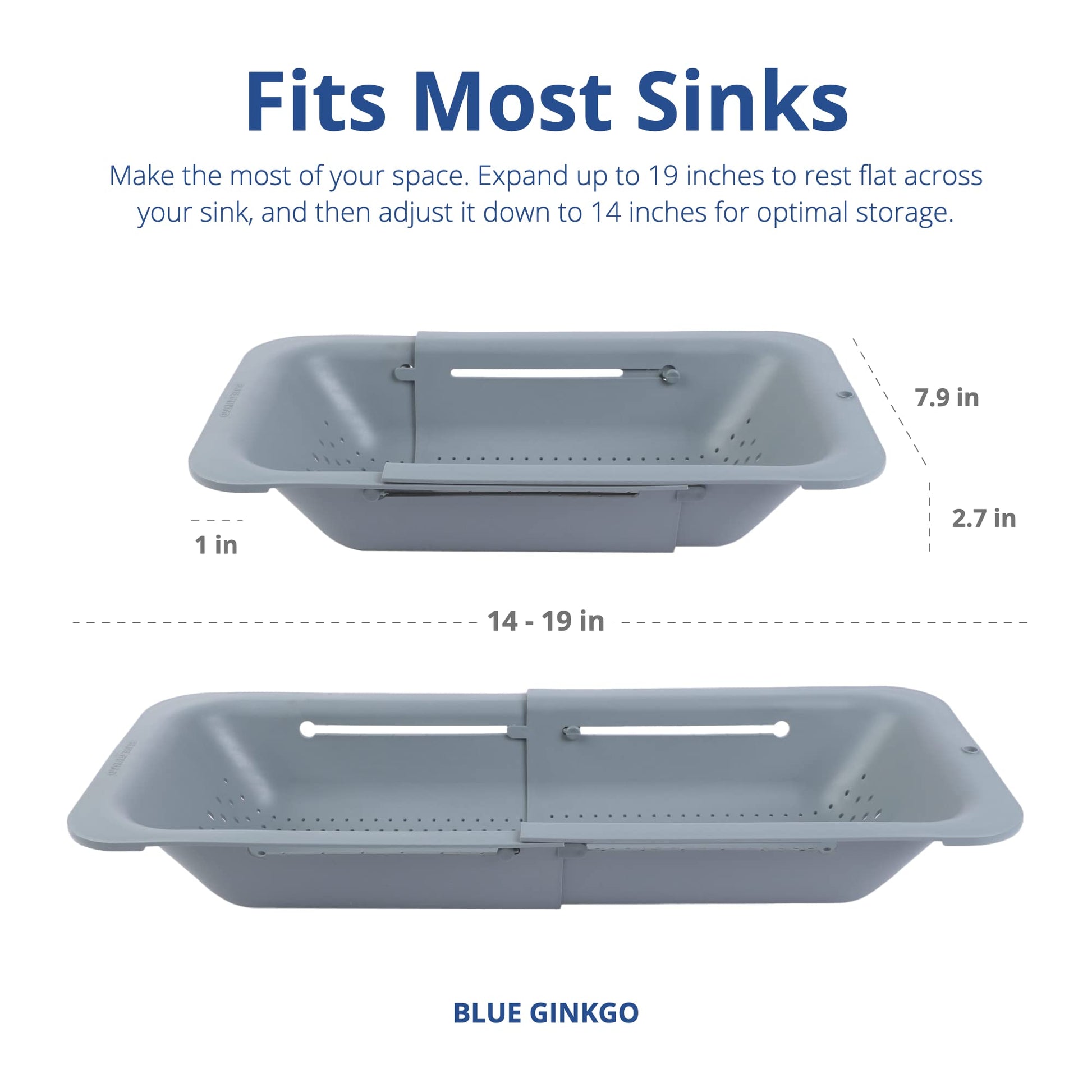 BLUE GINKGO Over the Sink Colander Strainer Basket - Wash Vegetables and Fruits, Drain Cooked Pasta and Dry Dishes - Extendable - New Home Kitchen Essentials (7.9W x 14-19L x 2.75H) - Gray