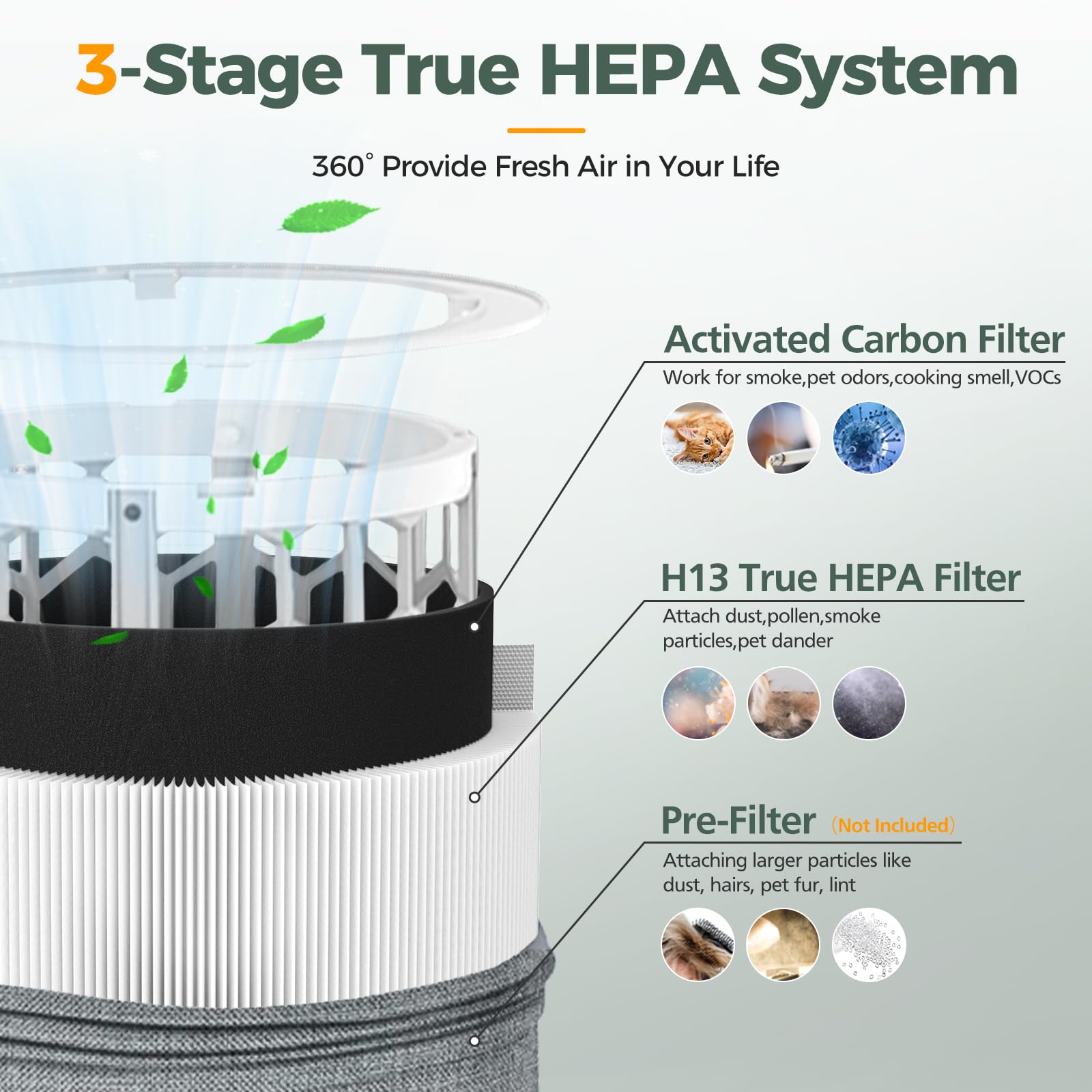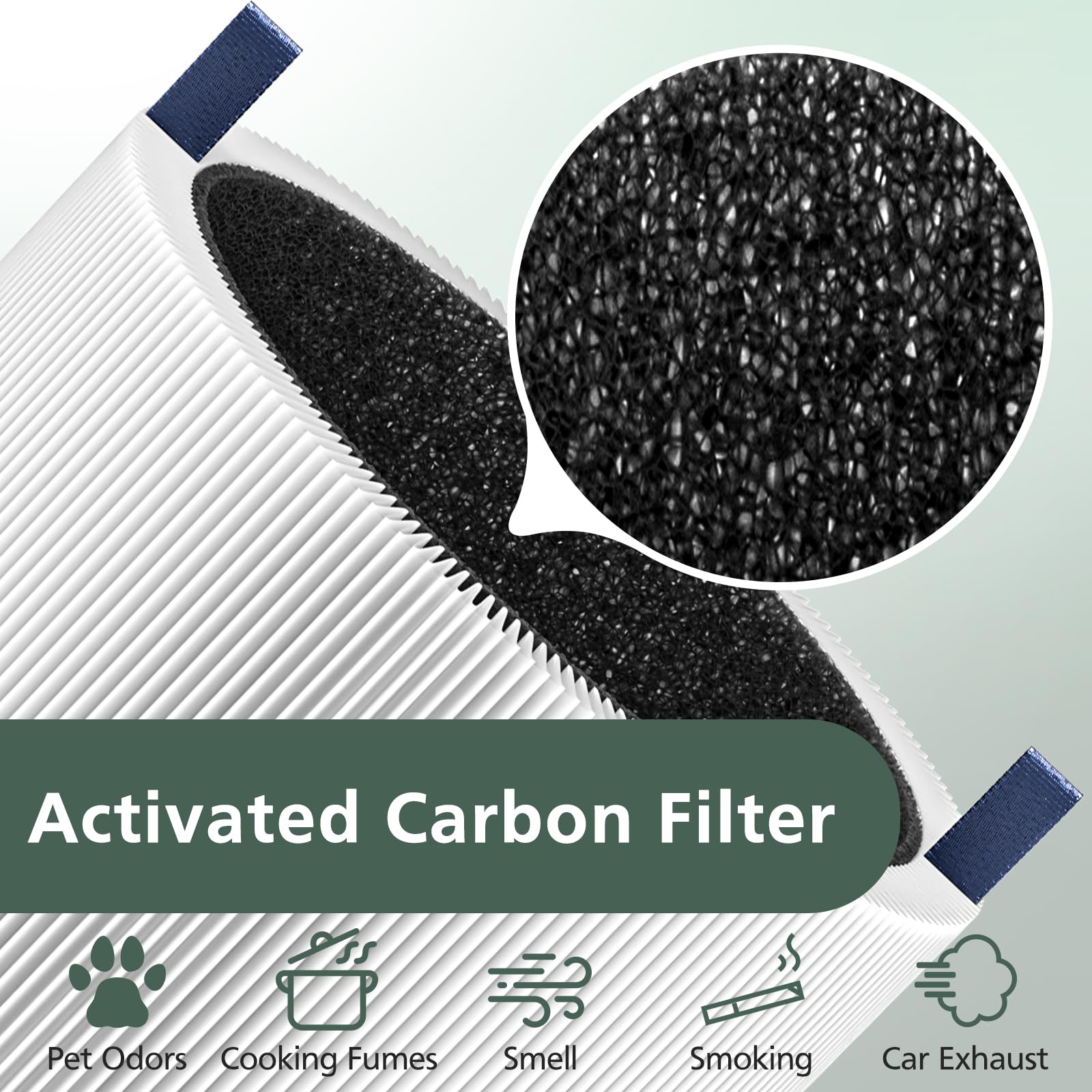 • ใ€High Efficiency Filtrationใ€‘- Our Blue Pure 511 filter replacement is designed with a double layers high efficiency filtration system. The H13 True HEPA filter effectively attaches 99.97% of airborne particles down to 0.3 microns such as pollen, dust, pet dander, and other tiny particles. Additionally, the Activated Carbon Filter swiftly and efficiently tackles household odors from pets, cooking, smoke, wildfires, and VOCs, ensuring a fresher and cleaner indoor environment