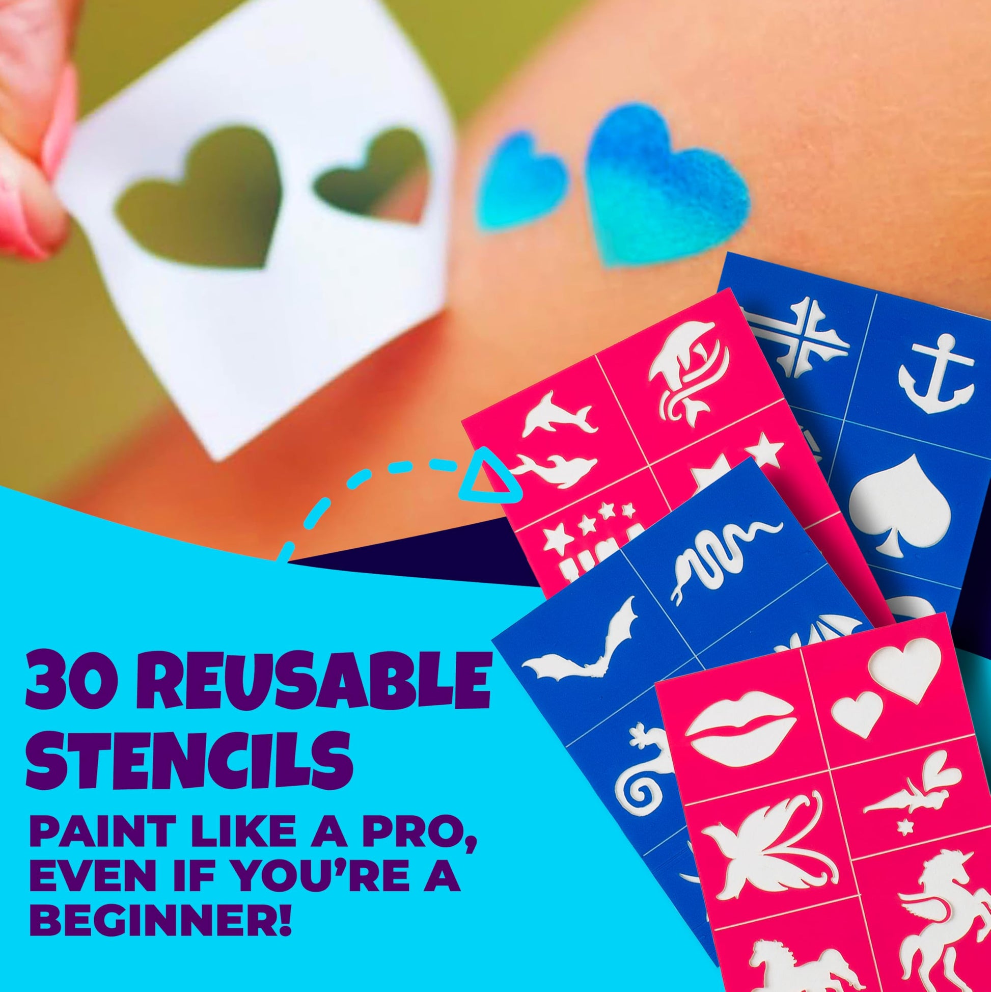 • 🎨 π—¨π—Ÿπ—§π—œπ— π—”π—§π—˜ 𝗨𝗩 π—”π—–π—§π—œπ—©π—”π—§π—˜π—— π—™π—”π—–π—˜ π—£π—”π—œπ—‘π—§ π—žπ—œπ—§: Illuminate your creativity with Blue Squid UV glow in the dark black light activated face painting kits. Featuring 2O vibrant UV Neon colors for face and body paint art that glow in the dark, 24 reusable stencils, body glitters, 3 brushes, 4 sponges, 16 design booklet and mini UV light. Perfect for unforgettable family moments and glow parties that shine!