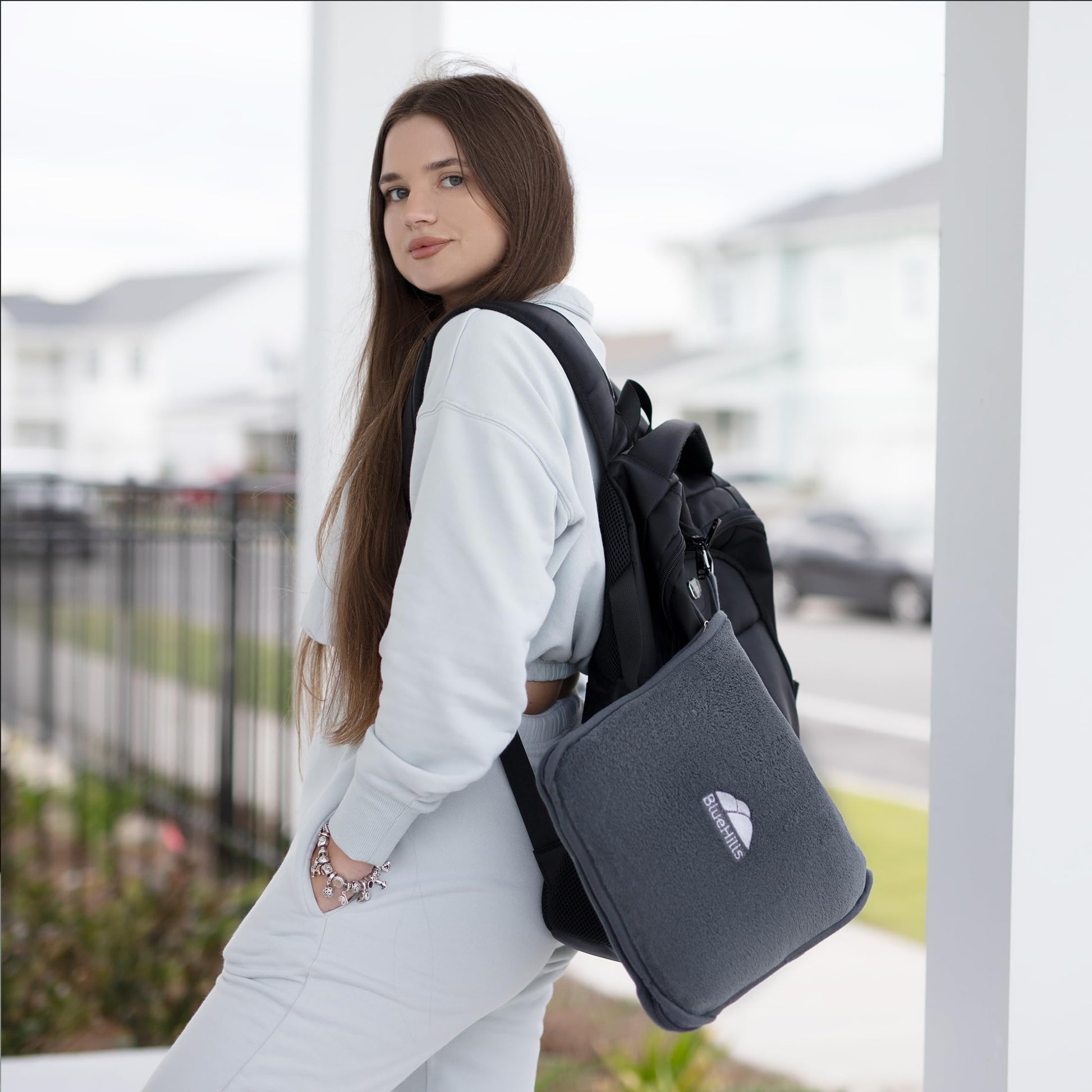 • Backpack clip included in the package: With the backpack clip / carabiner, you can clip this blanket pillow to any backpack or to any other luggage - with the soft gray travel blanket.