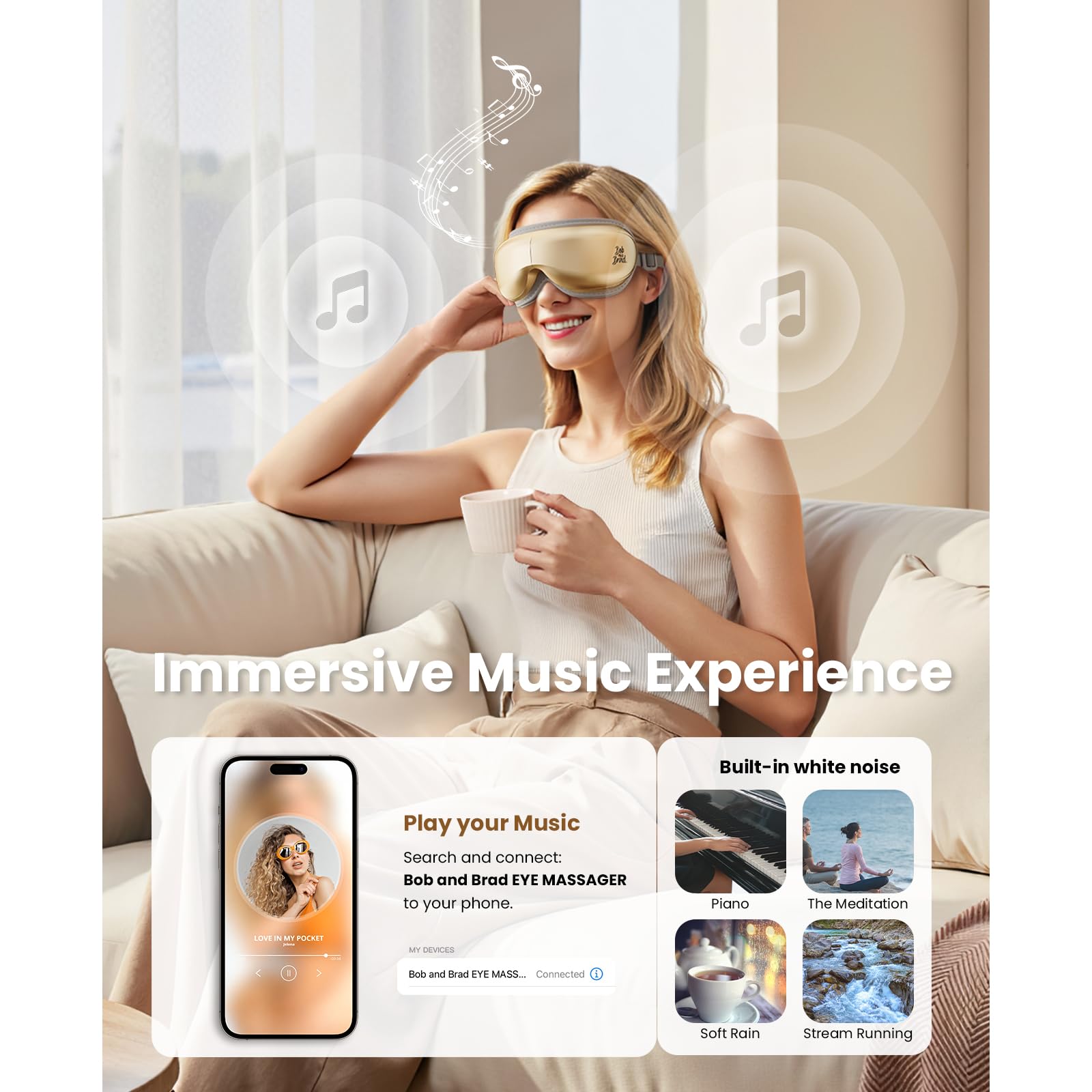 • Quieter Motor & Customizable Music - Our upgraded electric eye care device incorporates low-noise technology reduces audible noise from 60dBA to just 45dBA, so that you can enjoy a low-noise, comfort, warm nap. The built-in white noise music helps to reduce anxiety and can be turned off at your convenience. You can also connect the massager to your phone or tablet to play your own playlist. Simply wear it for 15 minutes before going to bed every night to relax and enjoy a better night's sleep