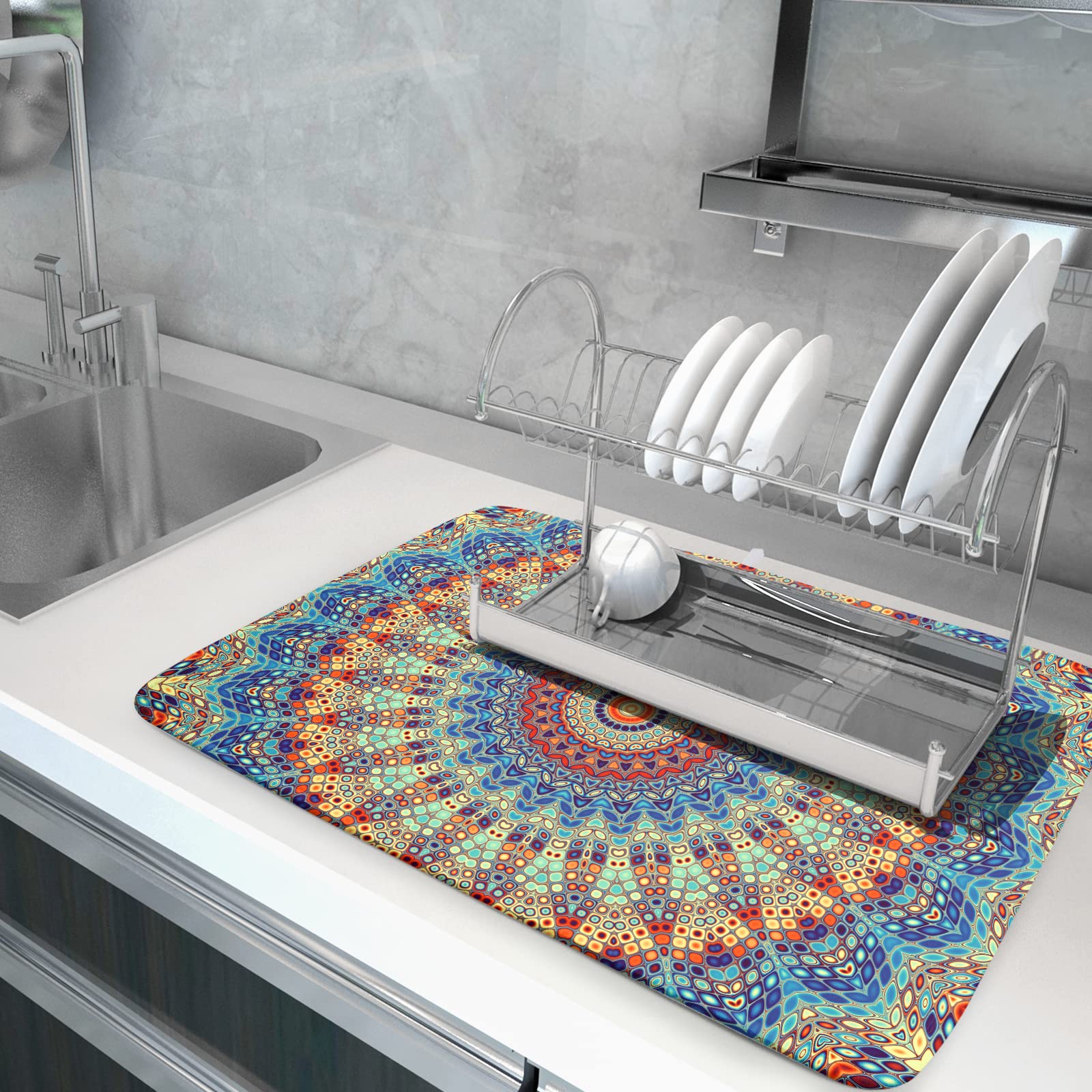 Bohemian Mandala Dish Drying Mat for Kitchen Counter Boho Ethnic Drying Mat 18 x 24 Inch with High Absorbent Reversible Microfiber Dish Drying Pad Dish Rack Pad Drainer Mat for Coffee Bar