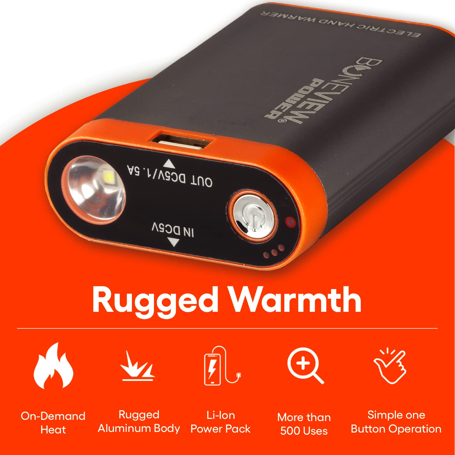 • EMERGENCY POWER BANK: If you plan to hunt or fish all day and realize your phone is almost dead, don't stress! Our warmer has a USB port to charge phones, tablets, digital cameras, and more. Get everything you need to bring modern devices into the wilderness with the BoneView Electric Hand Warmer.