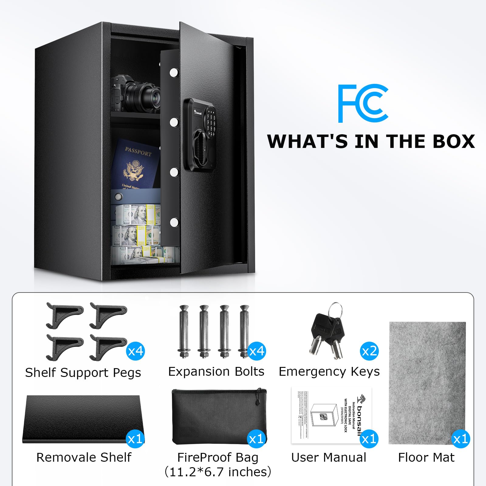 • What's in the Box: 1 x Bonsaii Large Safe Box, 1 x Fireproof Bag, 2 x Emergency Keys, 1 x Removable Shelf, 4 x Shelf Support Pegs, 4 x Expansion Bolts, 1 x Floor Mat, 1 x User Manual. Note: Batteries are not included