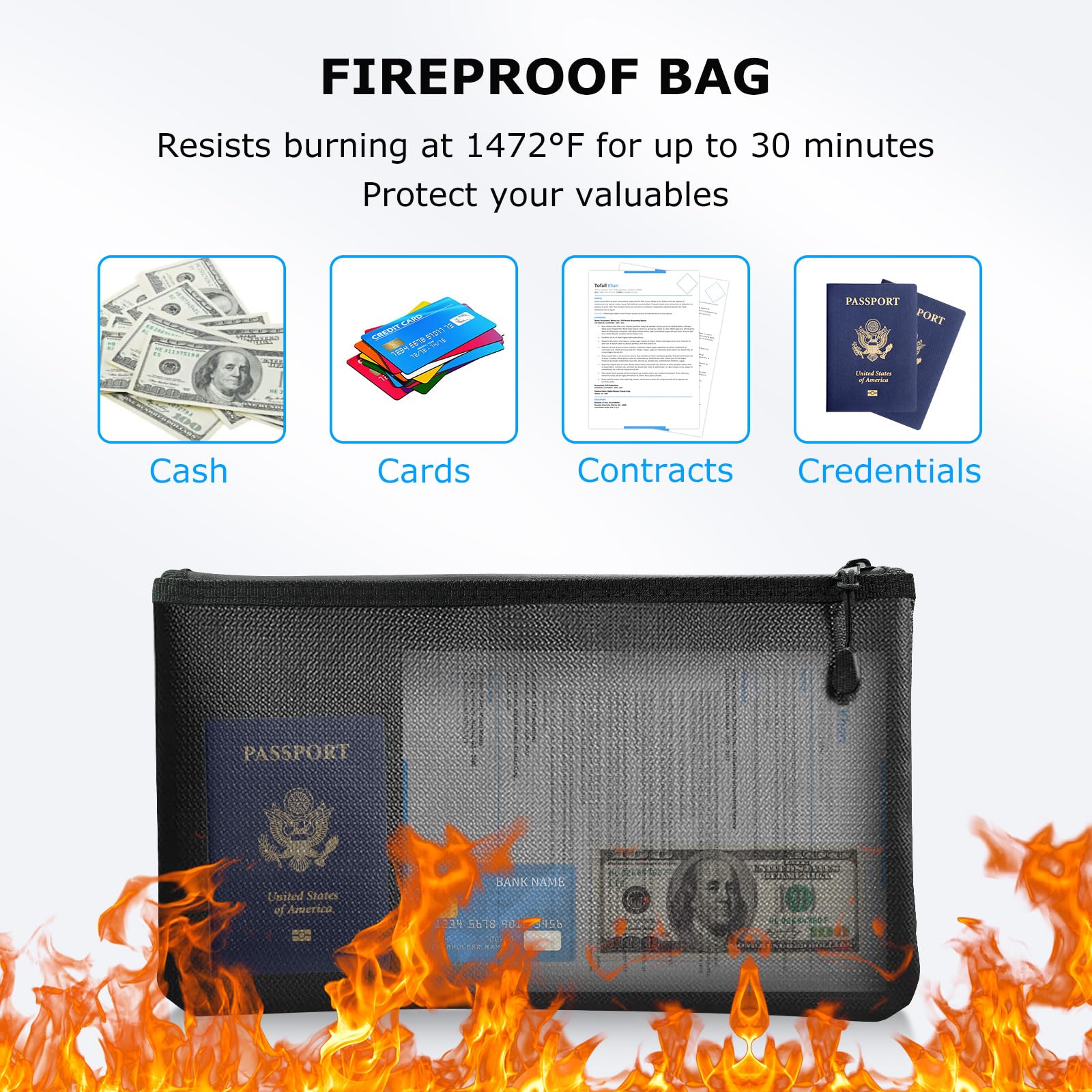 • Equipped with fireproof bag:The document safe for home comes with a fireproof bag (6.7' x 11.2'), offering users a further layer of security. The bag resists burning at 1472°F for up to 30 minutes,making it effectively protect your valuables such as documents, contracts, passports, cash, certificates, and more