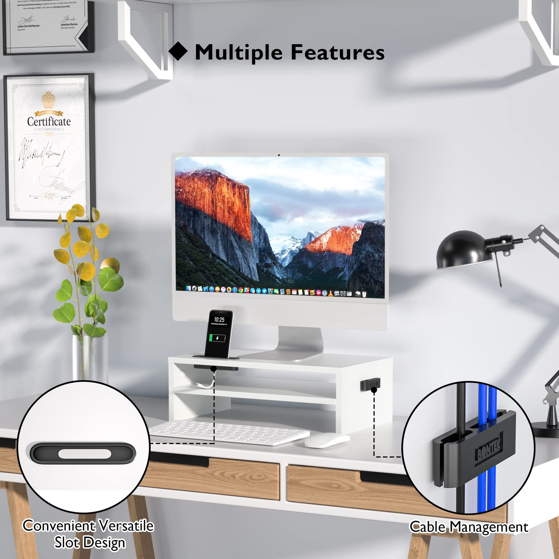BONTEC Wooden Monitor Stand Riser, 2-Tier Desk Shelf with Storage Organizer, Ergonomic Computer Stand with Cable Management, Cellphone Holder, White, 16.5 Inch