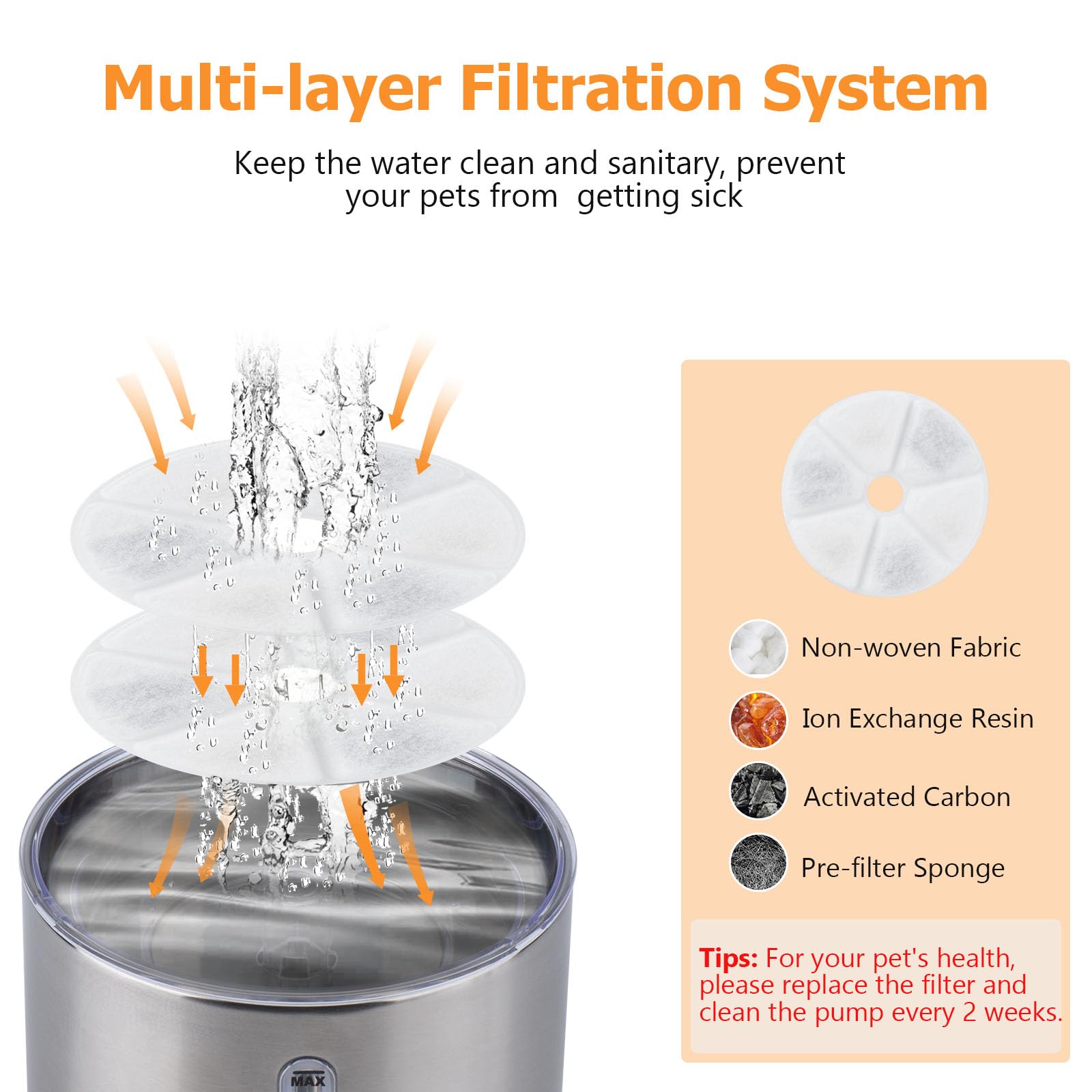 • 【Multi-layer Filtration System】 This dog water fountain has multiple filtration, including an activated carbon filter (consisting of high-density cotton, ion resin layer and activated carbon layer) and a filter sponge. The multi-filtration system filters hair, food particles, microorganisms and odors from the water