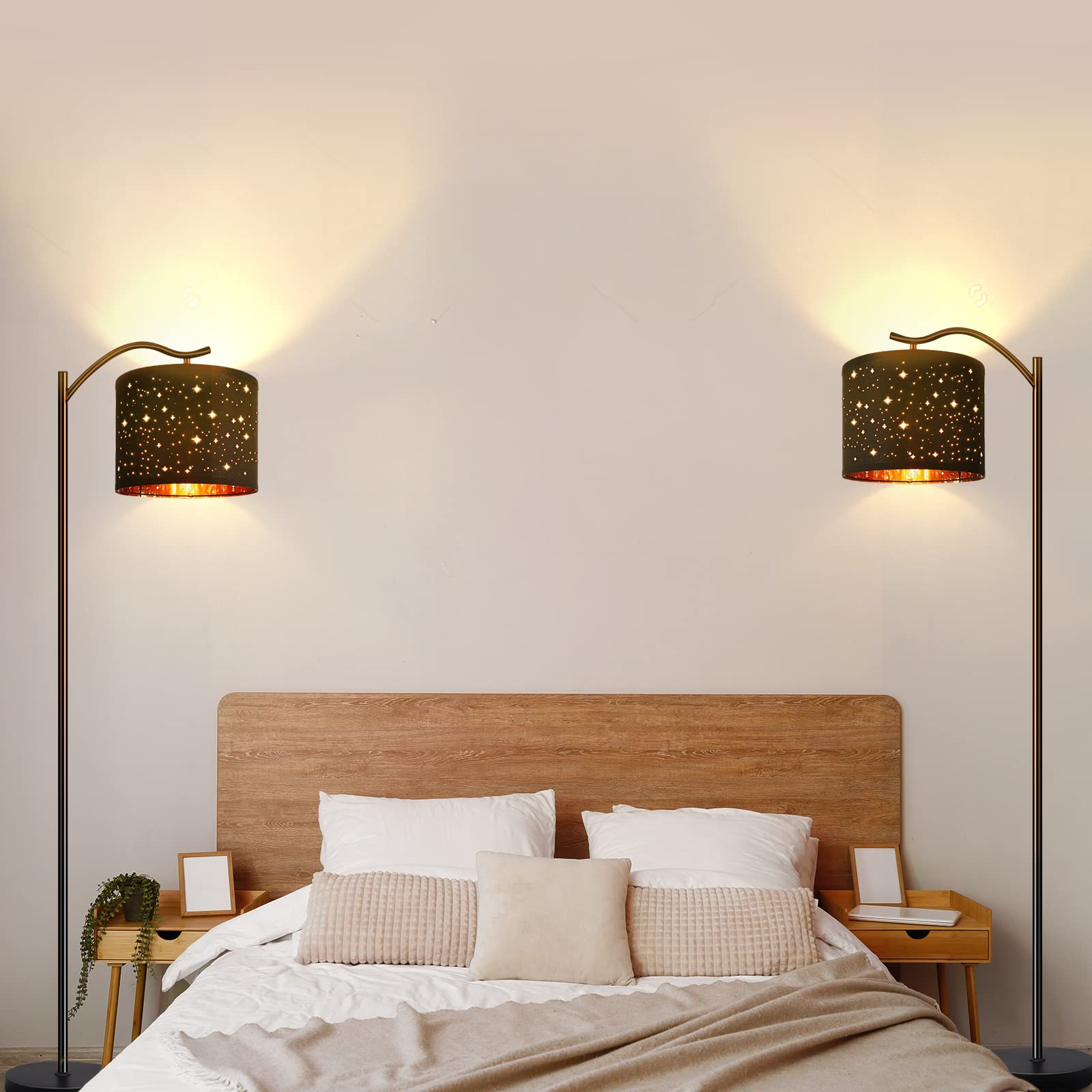 BoostArea Floor Lamp for Living Room,LED Arched Tall Modern Standing Lamp with Bohemian Linen Shade, E26 Socket, Footswitch,Black Mid Century Floor Lamp for Bedrooms,Office,Star Shade
