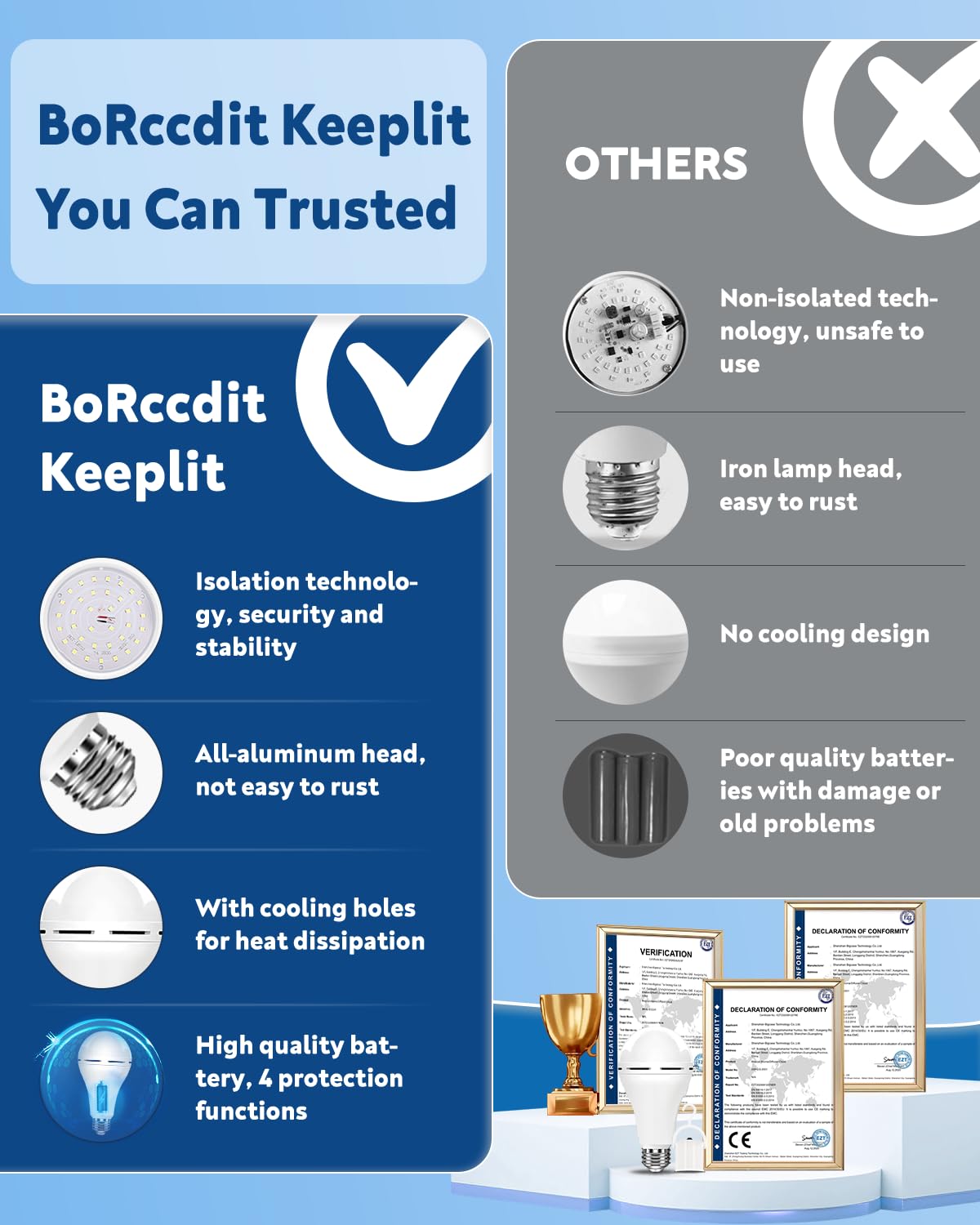 • Up to 48 Hours of Lighting:If you live in areas prone to power outages or impacted by hurricanes or snowstorms, these emergency light bulbs for power outage are the ideal solution. It provides up to 48 hours of continuous lighting, offering more than just illumination—it brings peace of mind through the night. Whether in the bedroom, living room, or hallway, its exceptional endurance ensures every corner stays bright as usual. BoRccdit Keeplit offers industry-leading battery performance and technology upgrade , making power outages no longer a problem, and darkness won’t let you stop in dark.