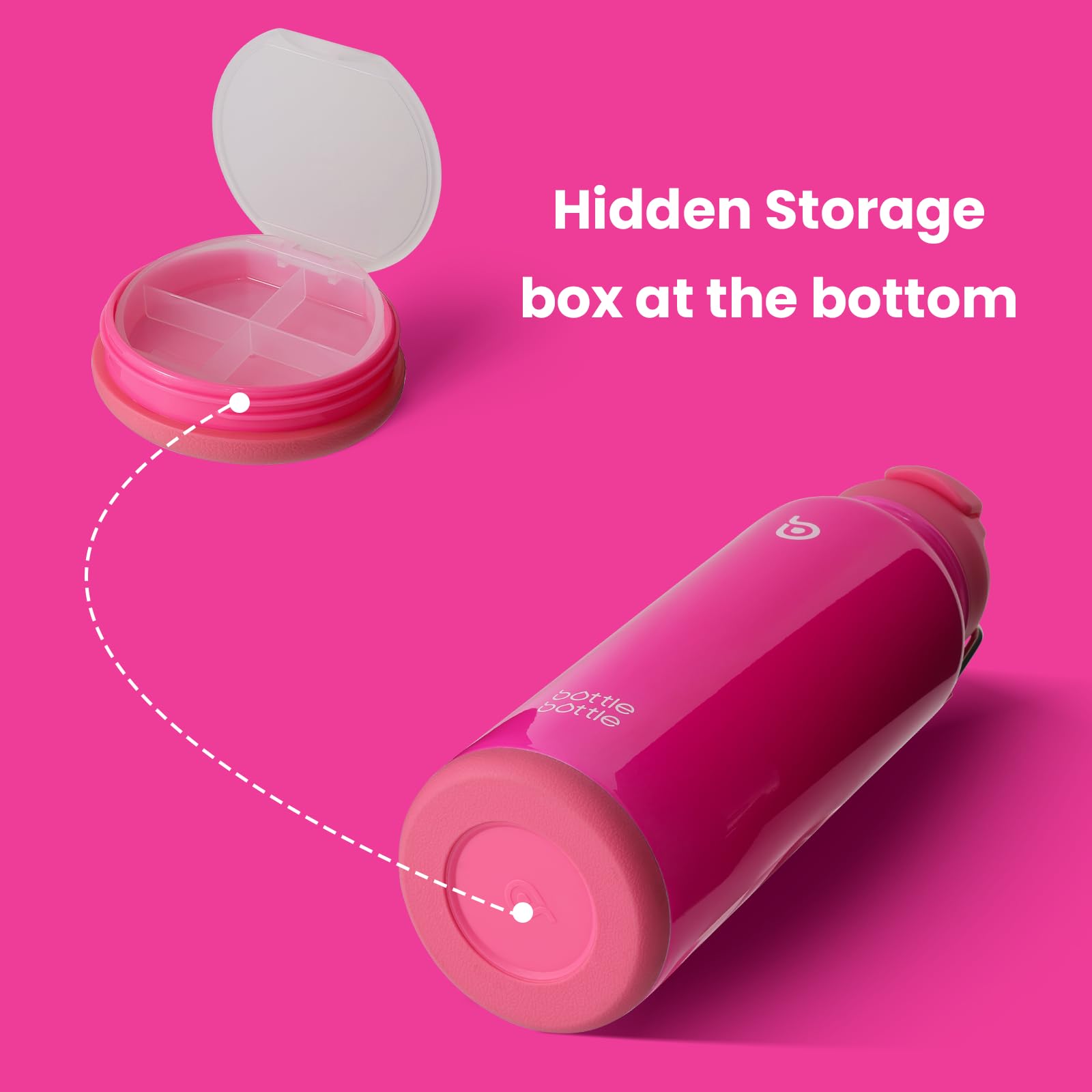 • [With Pill Box]: A storage space at the bottom of the 40 oz water bottle that can be swiveled open. You can use this space to store pills and vitamins, even coins and keys, also could be used as a pet bowl for water and snacks when on outings
