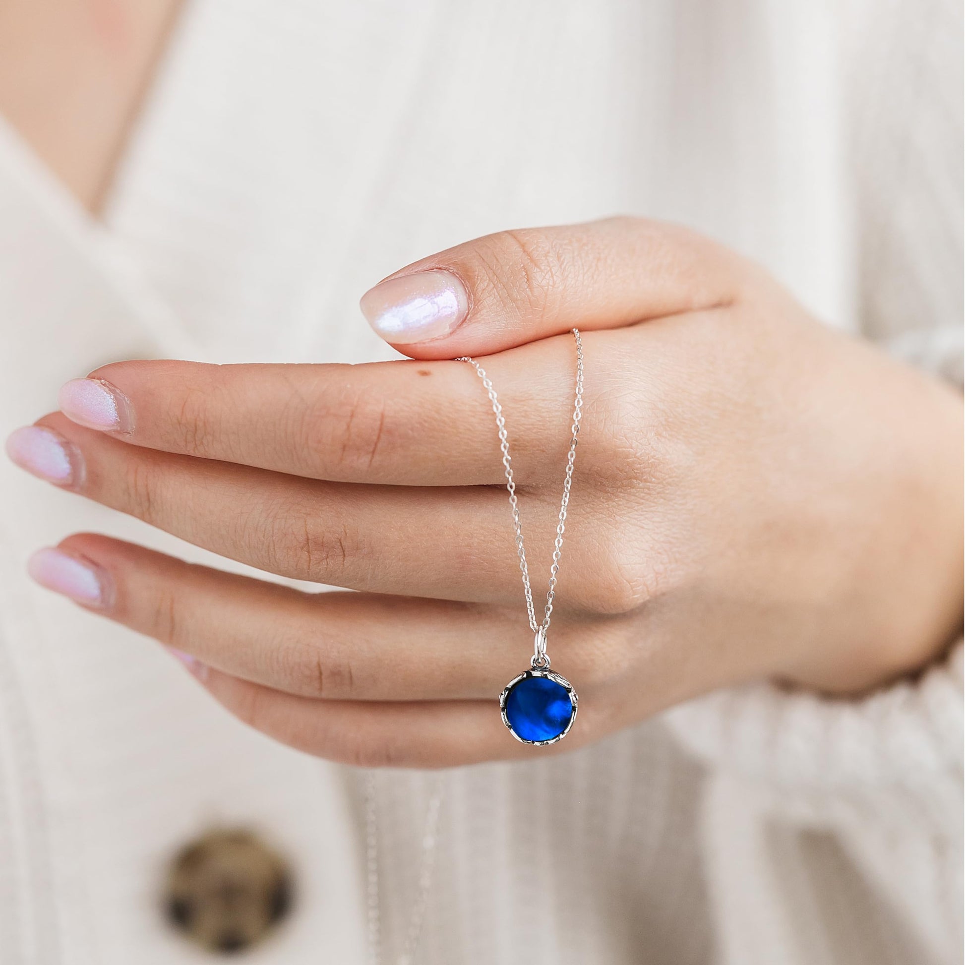 • Hanging from an 18' sterling chain, turn heads with this striking cobalt necklace, handmade from a recycled 1960s skin cream jar glass, paired with sterling silver. The vibrant blue shade adds a pop of color to any outfit, making it a standout piece for both day and night wear.