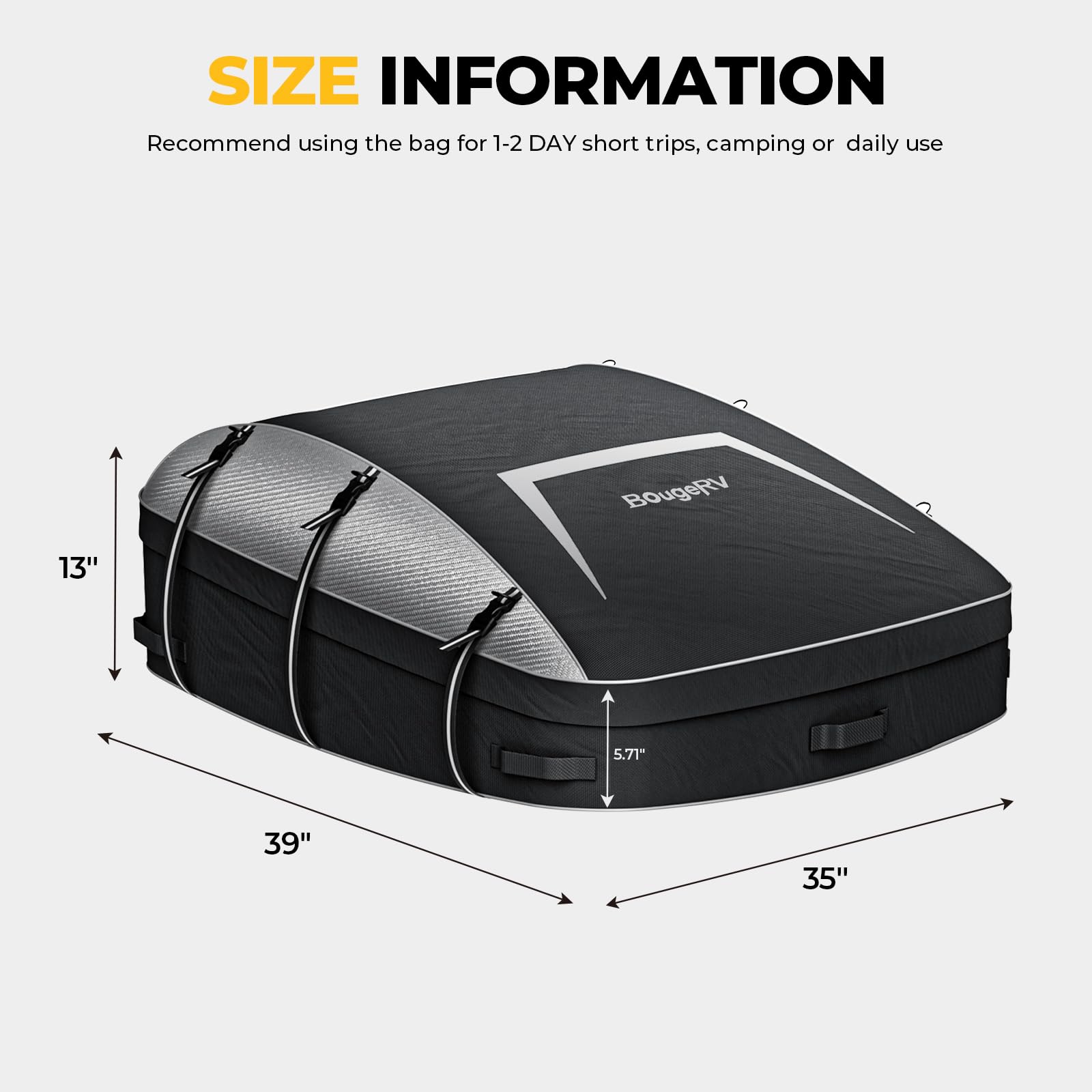 • Stylish & Safe: BougeRV soft car top carrier features a streamlined design that reduces noise levels and saves fuel. Reflective strips on the straps enhance nighttime visibility while maintaining a low profile during the day
