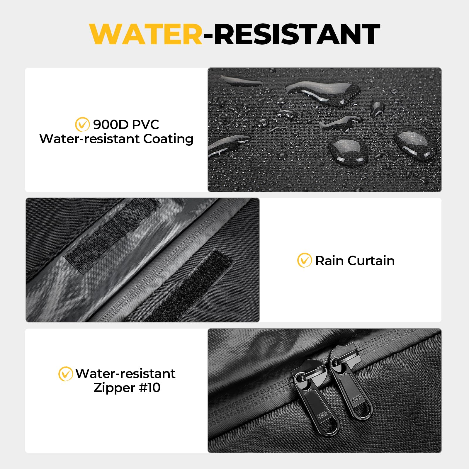 • Material: BougeRV roof bag is made of 900D PVC and features heavy-duty 10# zippers. NOTE: It is water-resistant, not fully waterproof. Moisture-sensitive items should be placed in waterproof plastic bags (not included) before storage