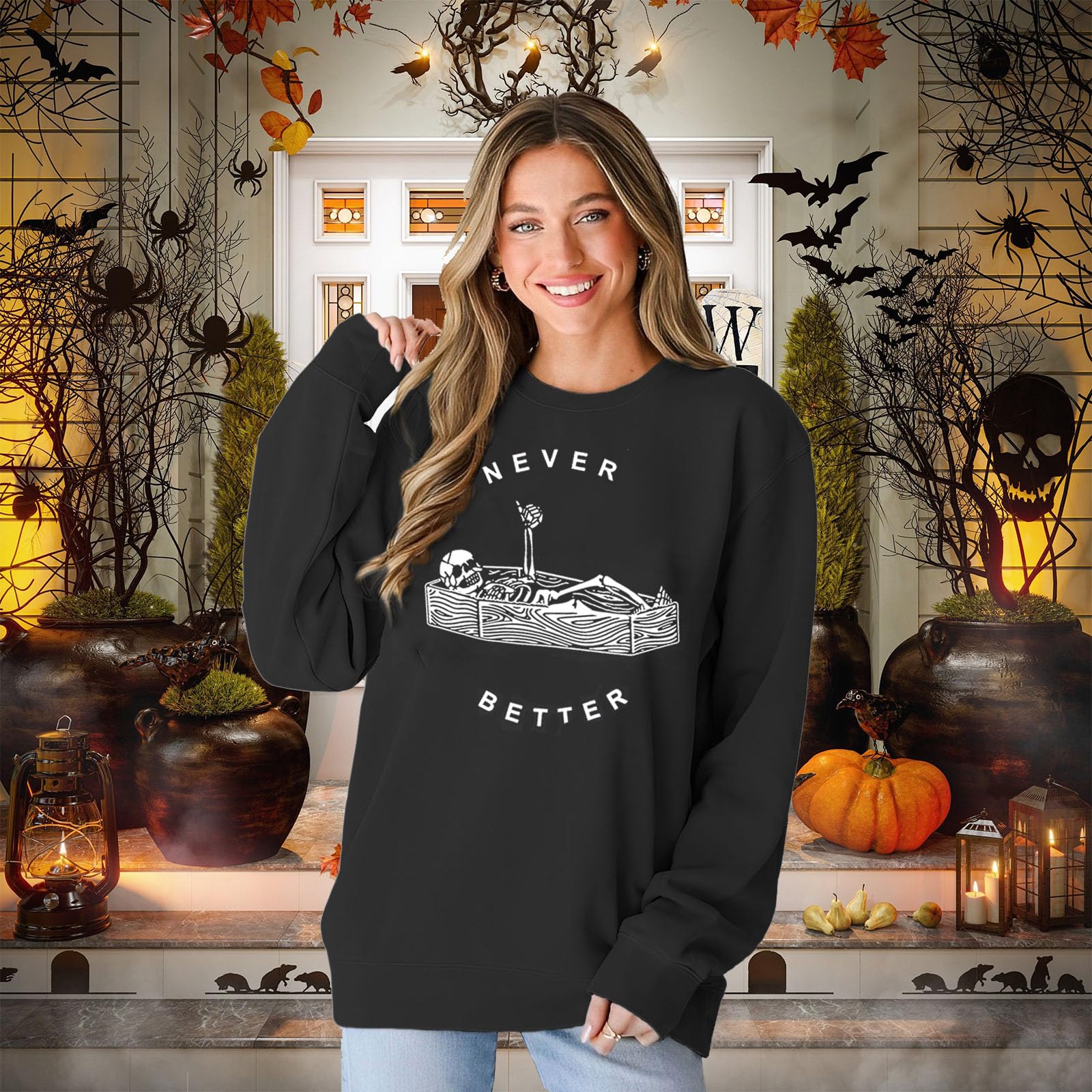 BOUTIKOME Never Better Skeleton Sweatshirt Women's Halloween Shirt Horror Skull Fall Long Sleeve Sarcastic Pullover Tops(Black,M)