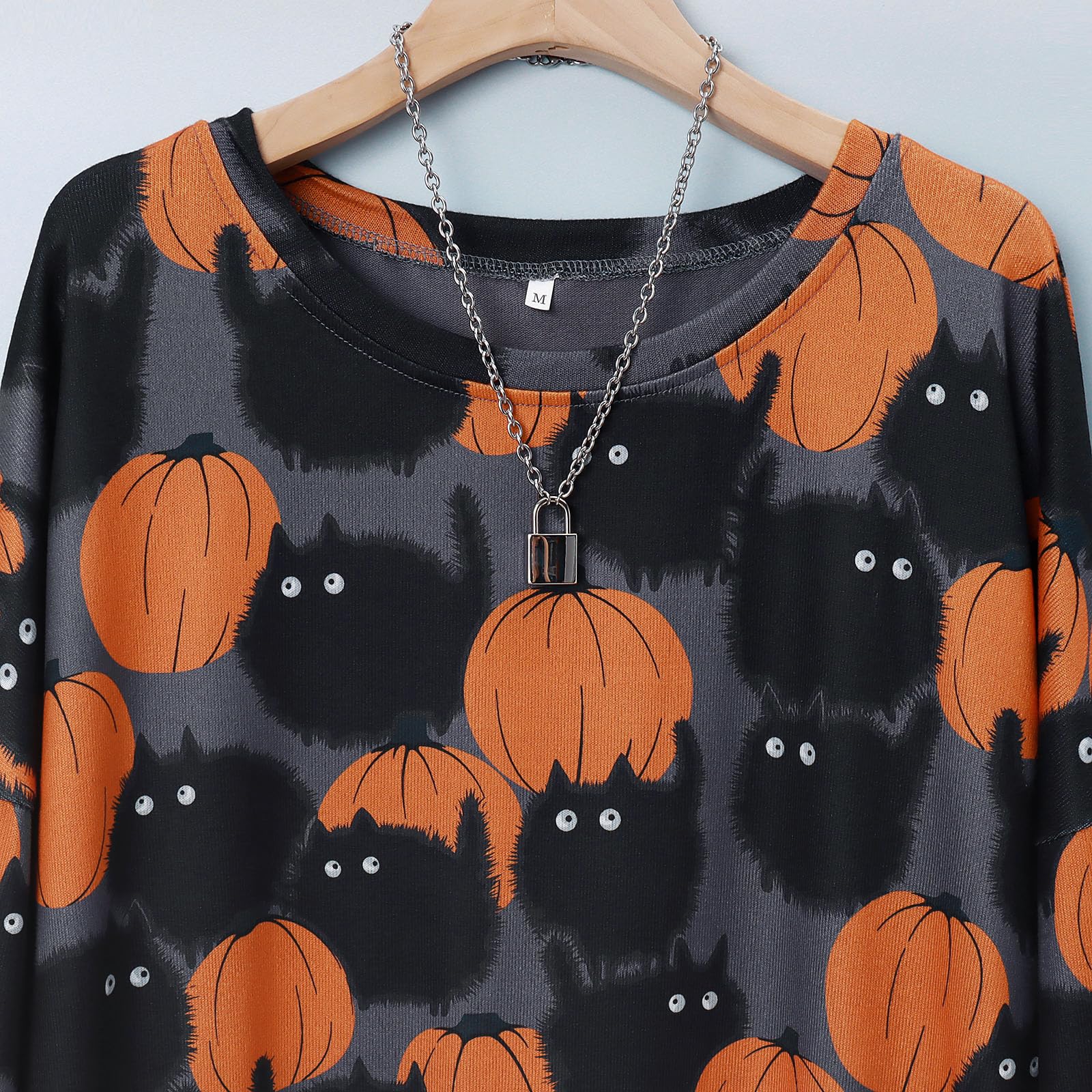 BOUTIKOME Womens Halloween Pumpkin Sweatshirt Black Cat Long Sleeve Crewneck Pullover Shirts with Pocket Tunic Tops (Dark Grey, X-Large)