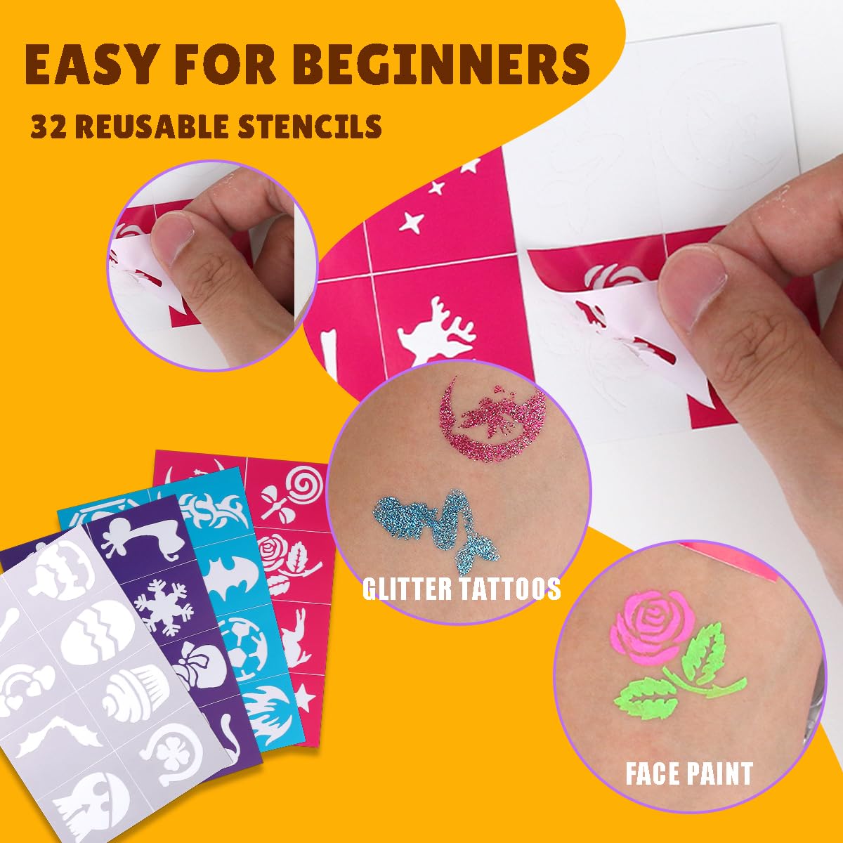 • βœ”EASY FOR BEGINNGERS: .NOT HAVE FACE PAINT SKILL? Don’t worry,we have prepared different pattern stencils, which makes face painting more easily, and save your time.You could also use glitters with stencil for glitter tatoos.