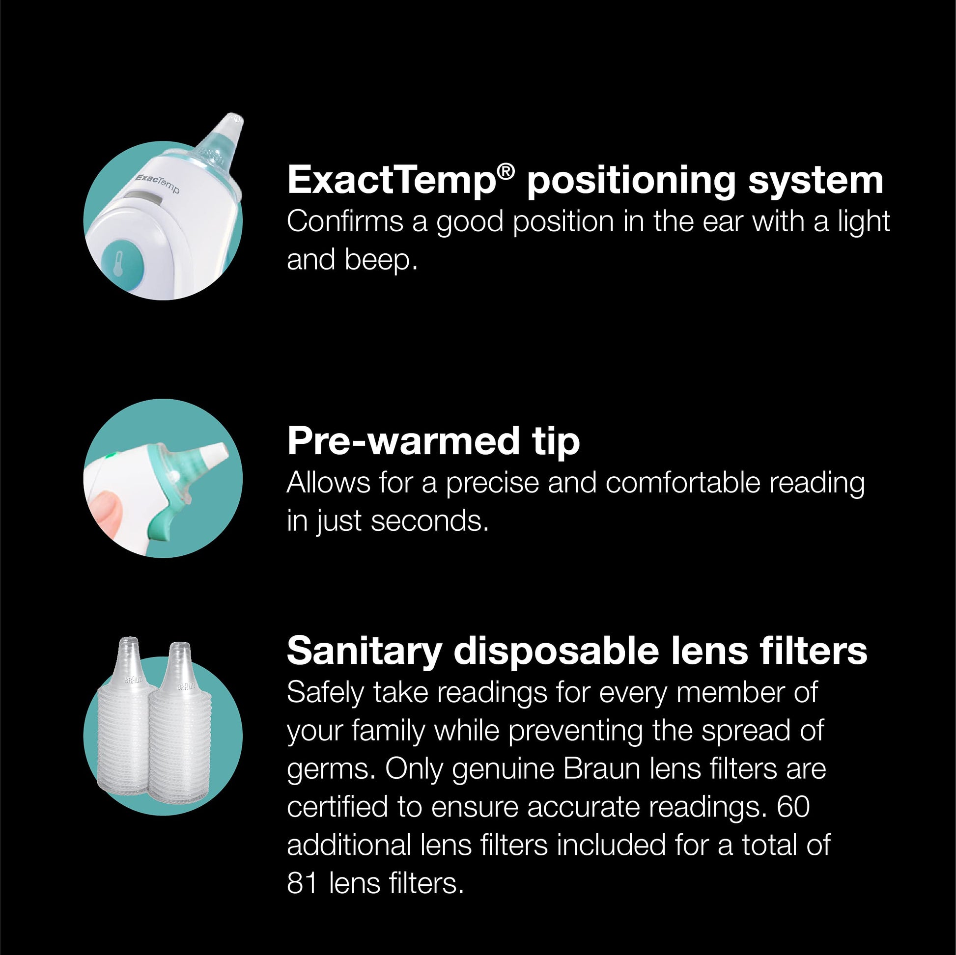 Details: When checking for a fever at home, you want accurate and reliable results, quickly. The Braun ThermoScan 6 (IRT6515) delivers. It’s an easy to use ear thermometer with an easy to read digital display and color coded temperature readings. Unlike other ear thermometers, where the cool tip of the thermometer in the ear may result in lower temperatures, this digital thermometer features a pre-warmed tip that ensures accurate temperature readings. It also features infrared technology that takes a temperature in seconds, and is gentle, so it’s a great choice for the entire family. Use it as a digital baby ear thermometer, for toddlers and kids and even as an adult thermometer. The disposable lens filters keep sharing sanitary. *Based on Ardent Consulting Survey reporting that of the surveyed pediatricians who recommend a brand of thermometers to their patients,  Braun is the most recommended brand, and of the surveyed pediatricians that use a branded thermometer, Braun is the most frequently used brand.