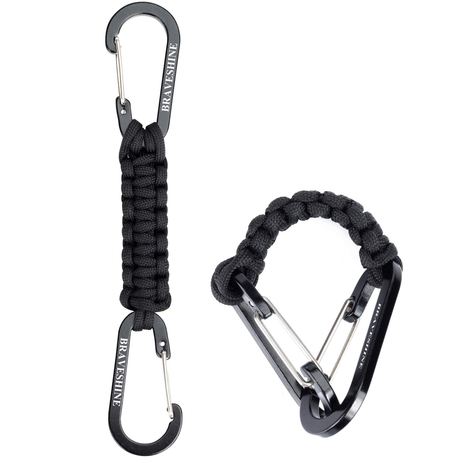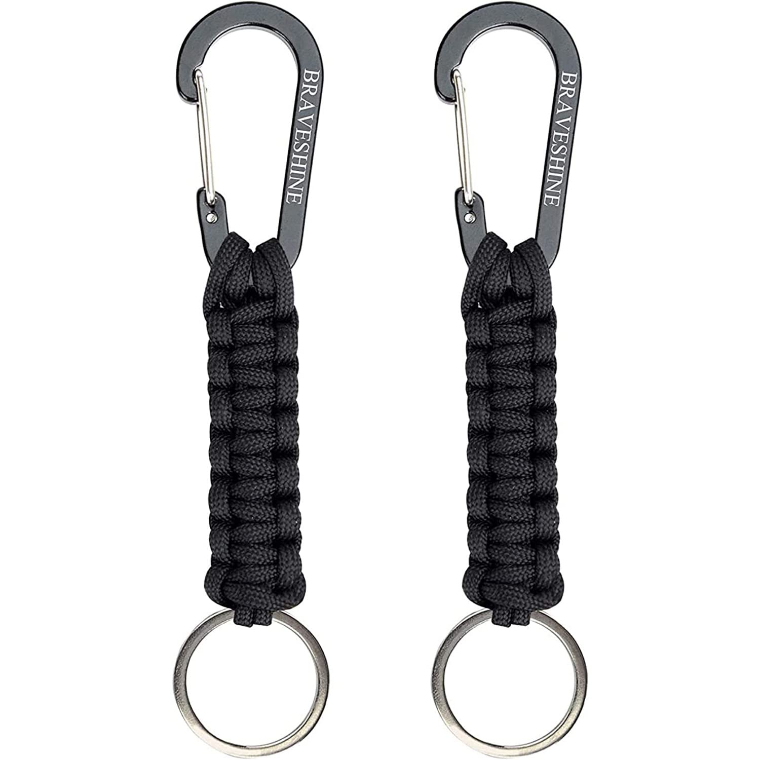 BRAVESHINE Keychain Hook with Paracord Strap 2 Pack Black Metal Key Ring Carabiner Hanger Para Cord D Locking Keyring Clip for Keys, Backpacks, Boys, Girls, Men, Women, Camping, Hiking, Travailing