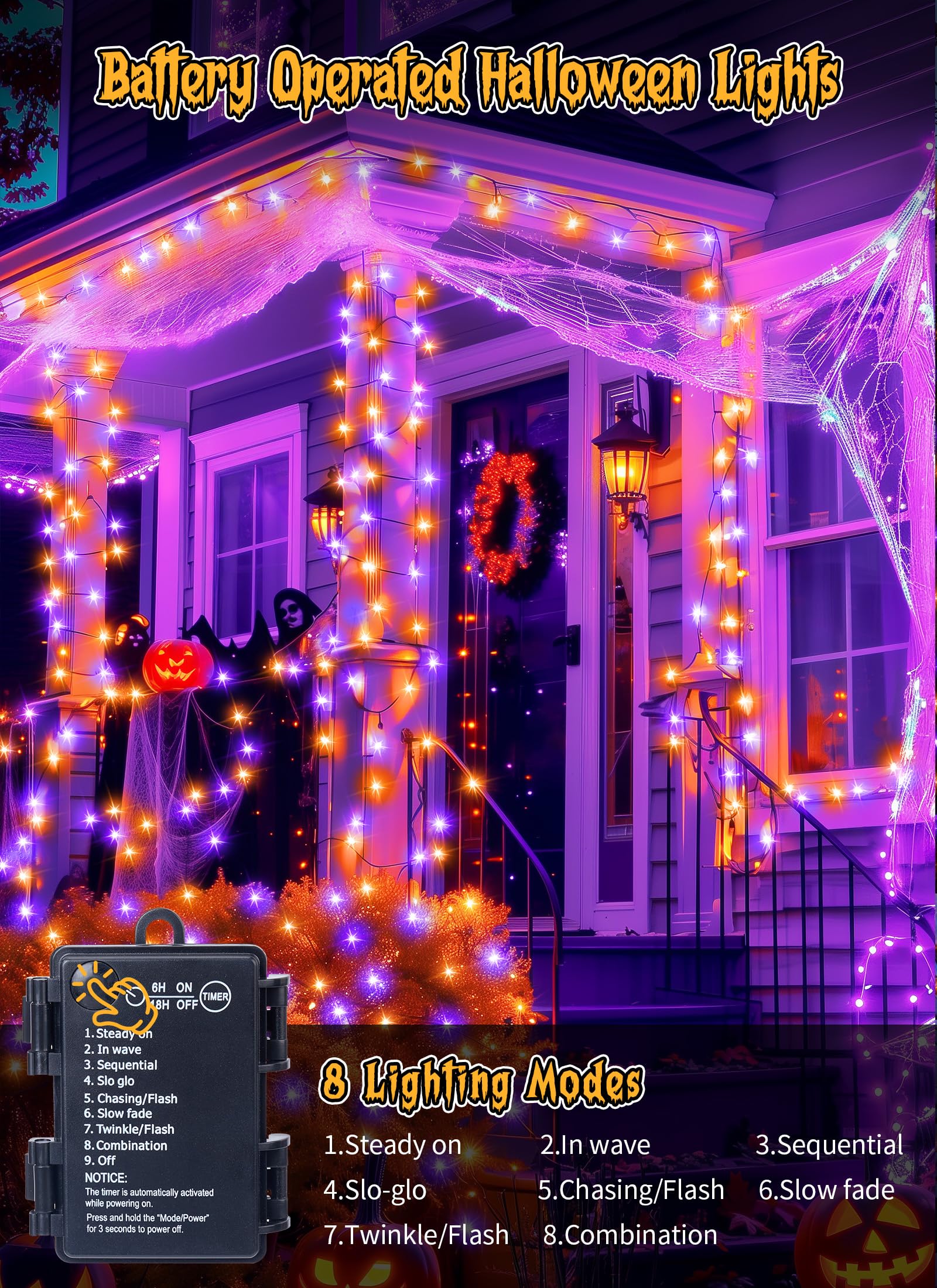 Brightown Halloween Lights Outdoor Battery Operated, 2 Pack Total 33FT 100 LED Battery Fairy Lights with Timer,8 Modes, Waterproof Halloween String Lights for Indoor Bedroom Decoration,Orange & Purple