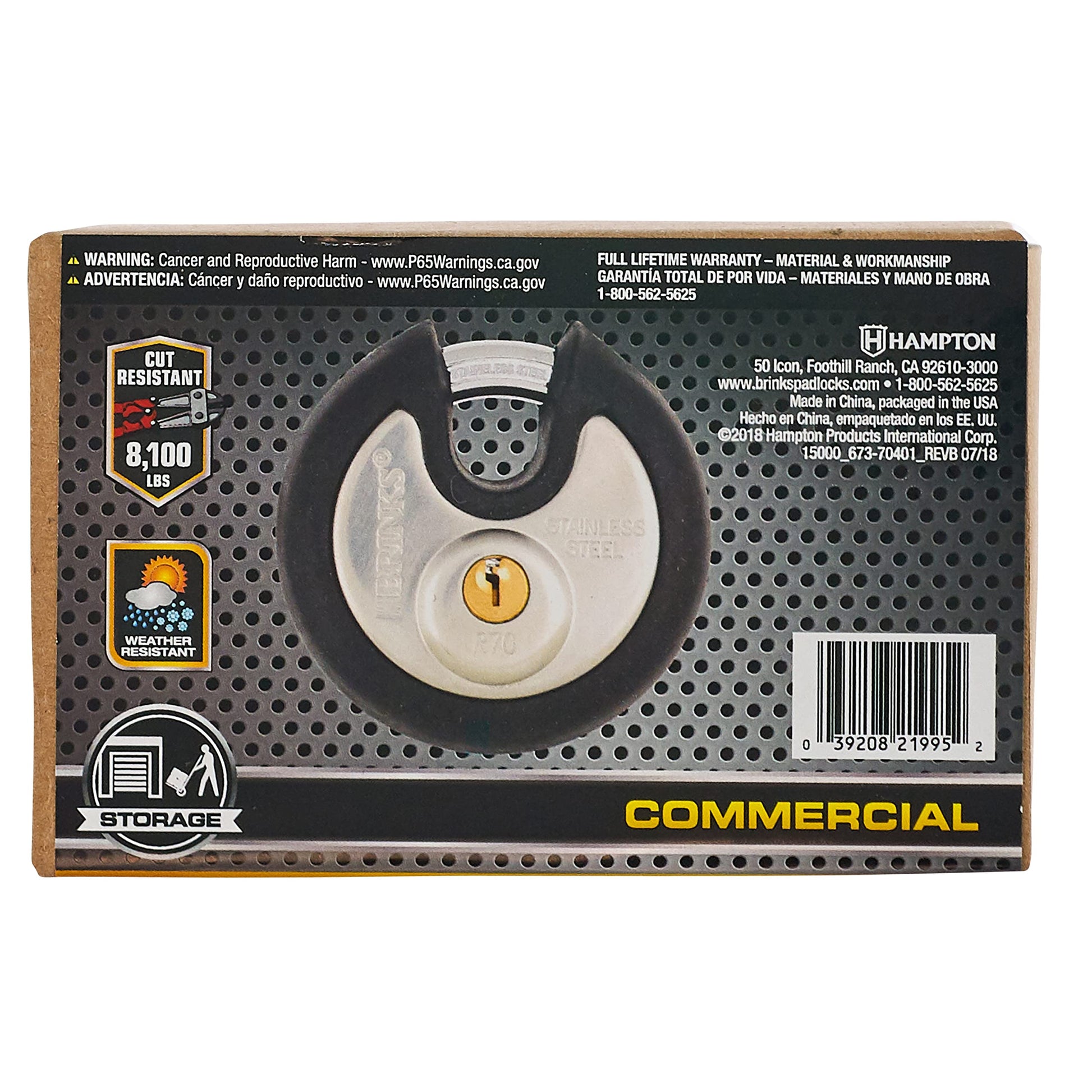 Details: BRINKS Heavy Duty Padlock works as storage locks for storage units, providing protection for your belongings. Crafted with a 70mm body and stainless steel shackle, this padlock with key resists corrosion and is suitable for both indoor and outdoor use, making it a suitable choice for storage sheds, garages, storage lockers, and more. The round shielded design and stainless steel shackle minimize exposure and prevent cutting. The full radius rubber bumper helps avoid scratches and dings on your surfaces. The four-pin brass tumbler cylinder offers pick and pry resistance and reliability as storage locks for storage units. Whether you need a toolbox lock, a lock with keys, or one for construction site storage, the BRINKS padlock is a reliable choice. The durable lock and key mechanism is designed for consistent performance. This BRINKS discus padlock can work in a variety of areas, from truck work boxes to sliding doors, and it comes with a limited manufactures warranty.