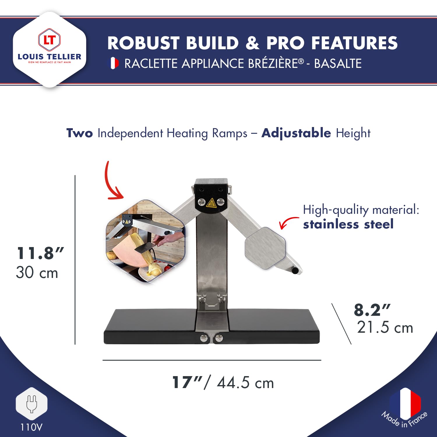• TRADITIONAL RACLETTE MACHINE: The Brézière raclette machine allows you to suspend a portion of cheese wheel and heat it continuously for on-demand serving. With a power of 110V, it is ideal for a table of 1 to 4 guests.