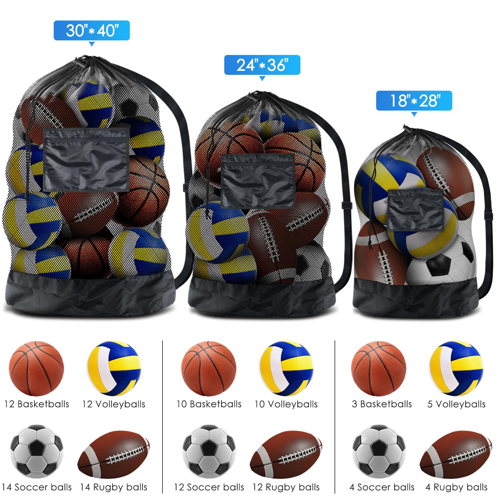 • LARGE HOLDING CAPACITY: Measures 18' x 28' Can hold 2-3 basketball, 3-4 soccer balls, 3-4 rugby balls, (Warning: Please note that the sizes of different types of balls vary. The number of balls this bag can hold will be directly influenced by the size of your balls. Please ensure that your balls match the bag's dimensions before purchase. The illustrations are for reference only and do not represent the actual capacity.)