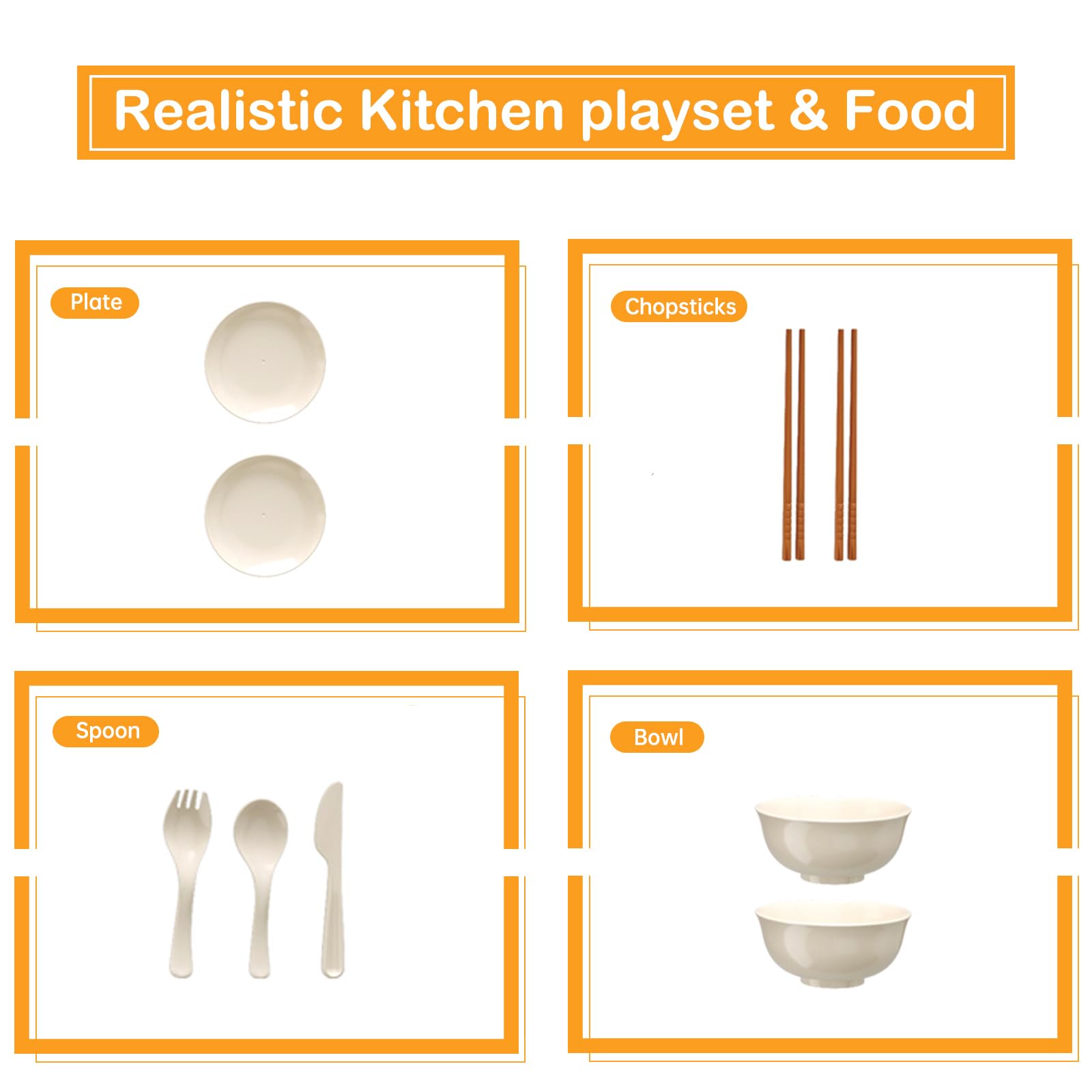 • Complete Kitchen Cooking Toy Set - Each kitchen set comes with 32 pcs fun, cute and engaging pretend kitchen toys, include play pots and pans sets, kettle, bowls, plates, chopsticks, toy kitchen cookware, knives set, canned pretend food & vegetables, easy storage and much more to provide endless hours of fun.