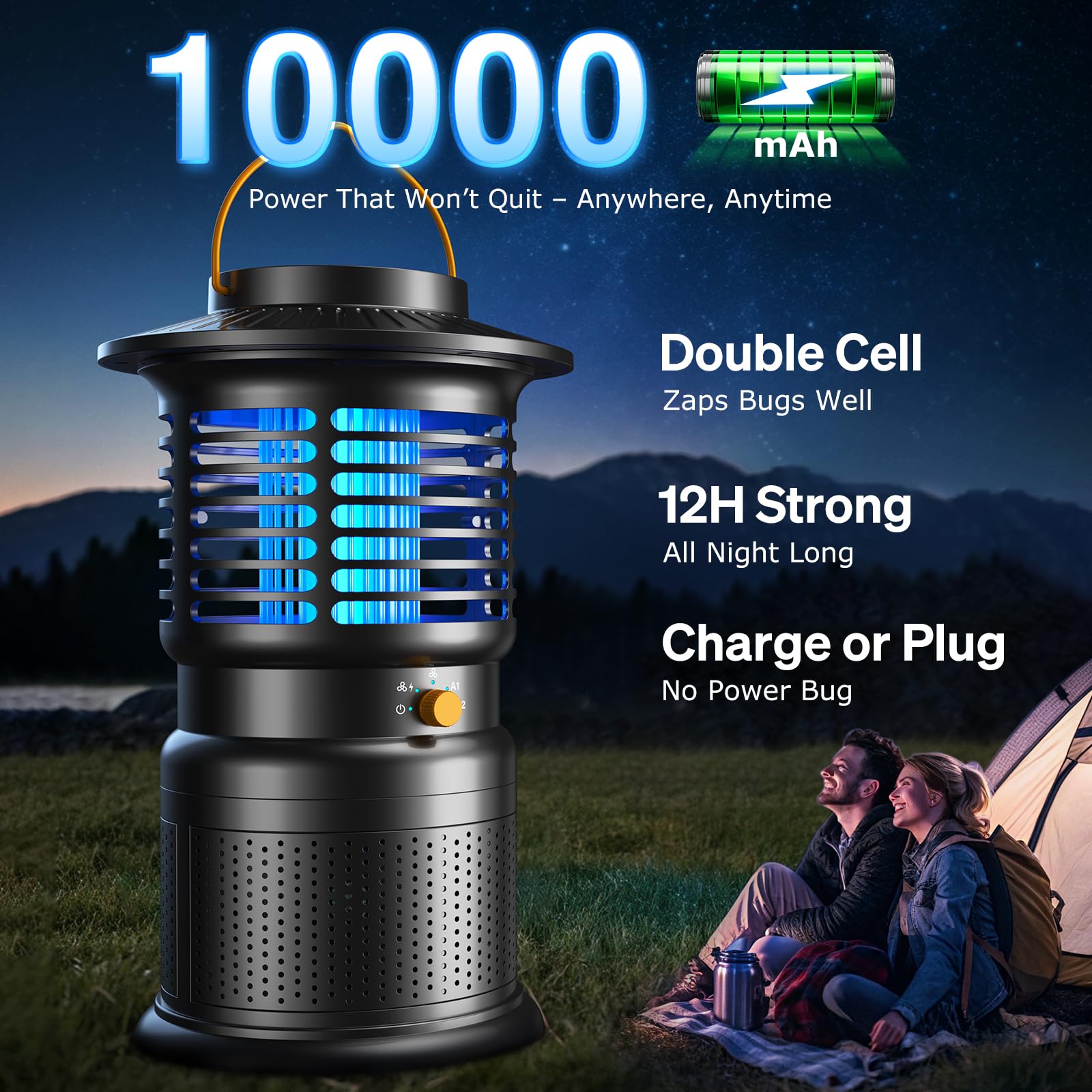 • 【Long-Lasting Power & Flexible Usage】Tired of constantly charging your mosquito zapper? The rechargeable bug zapper offers an incredible 10,000mAh battery life, allowing for hours of uninterrupted use —far outlasting competitors with only 4,000mAh. You can also plug it in for continuous operation. Whether you're at home or camping, the long-lasting battery ensures maximum convenience, so you never have to worry about pests ruining your outdoor fun
