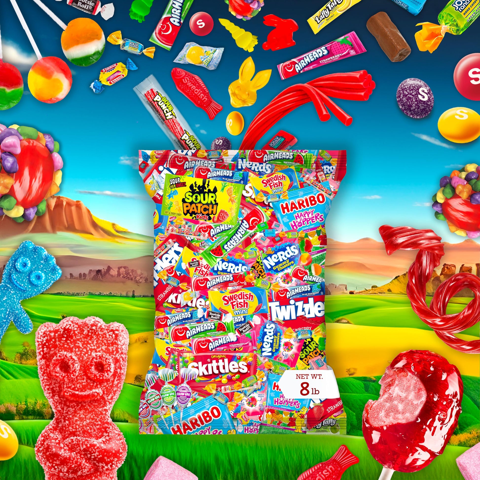 • Assorted Candy Variety Pack: Contains 8 different types of candy like Lifesavers, Sour Patch Kids, Lollipops, Pez, Tootsie Rolls, Smarties, Sour Candy and More