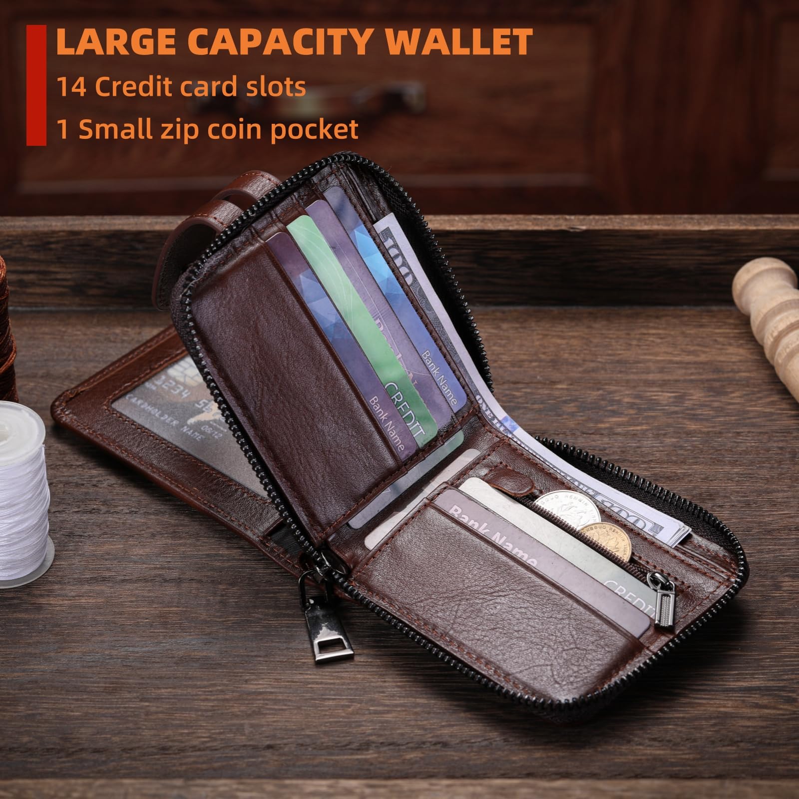 BULLCAPTAIN Genuine Leather Men's Wallet with Zipper Vintage RFID Blocking Large Capacity Wallet for Men with 14 Credit Card Slots and 1 ID Window T23 (Coffee)