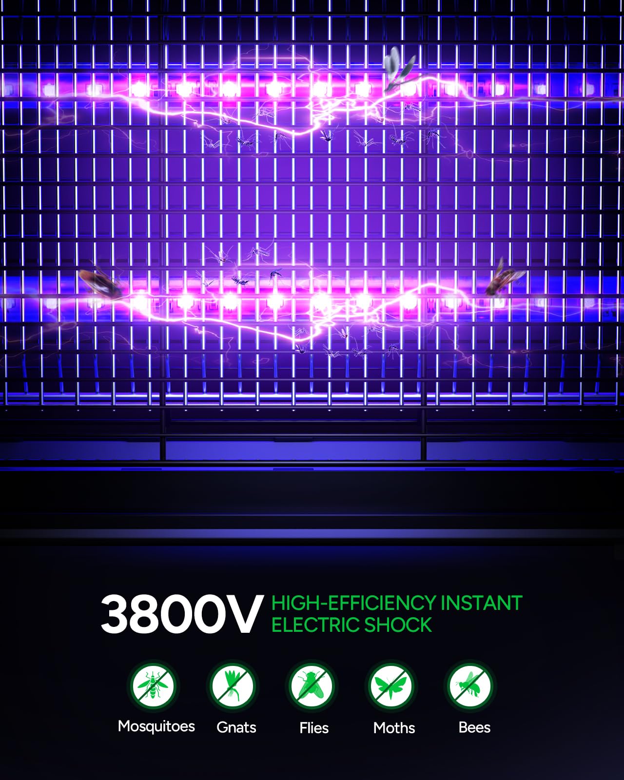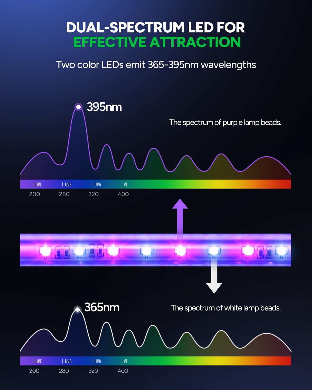 • High-Efficiency Energy-Saving LED Tubes: Our bug zappers use 5W low-energy consumption LED tubes, boasting a long lifespan of up to 30,000 hours. Utilizes a blend of 365nm and 395nm wavelength LED beads, producing a dual-tone light spectrum. This combination is more effective in attracting a wide variety of insects, including mosquitoes, gnats, flies, and moths, to quickly hit them with high-voltage electricity.