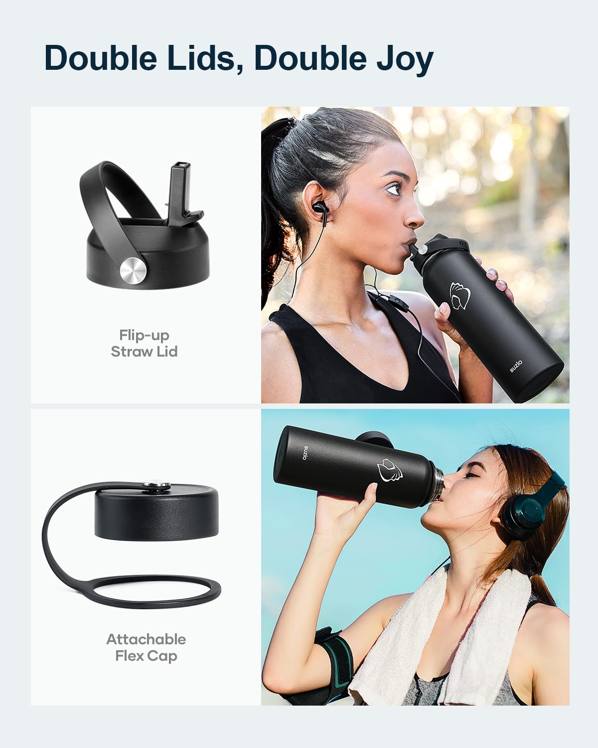 • 2 Caps Pack: This 40 oz stainless steel water bottle comes with straw lid and flex cap, the flex cap is perfect for the beach, camping and hiking, while the straw lid is suitable for cycling and road trip