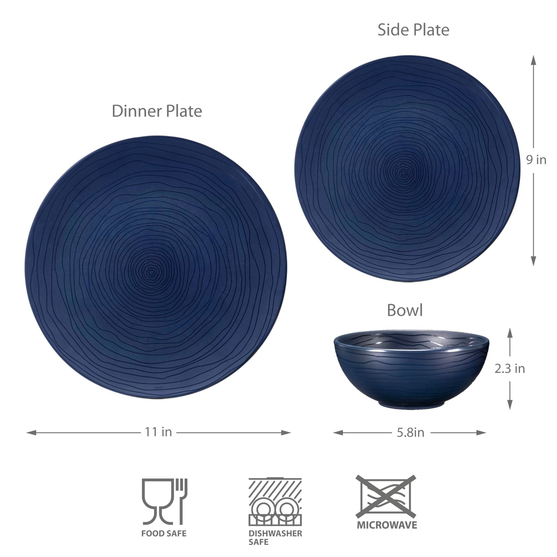 Bzyoo 12 Piece Melamine Dinnerware Set - Durable, Dishwasher Safe, Organica Navy Blue Plates and Bowls Sets Casual Dish Set for Dining, Outdoor and Kitchen