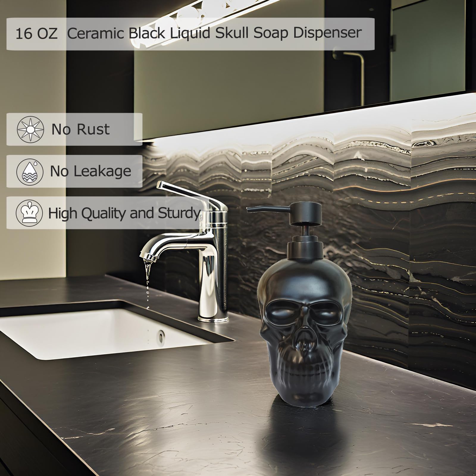Caahanjia Ceramic Skull Soap Dispenser, Refillable Halloween Liquid Hand Soap Dispenser for Bathroom and Kitchen, Halloween Skull - Black