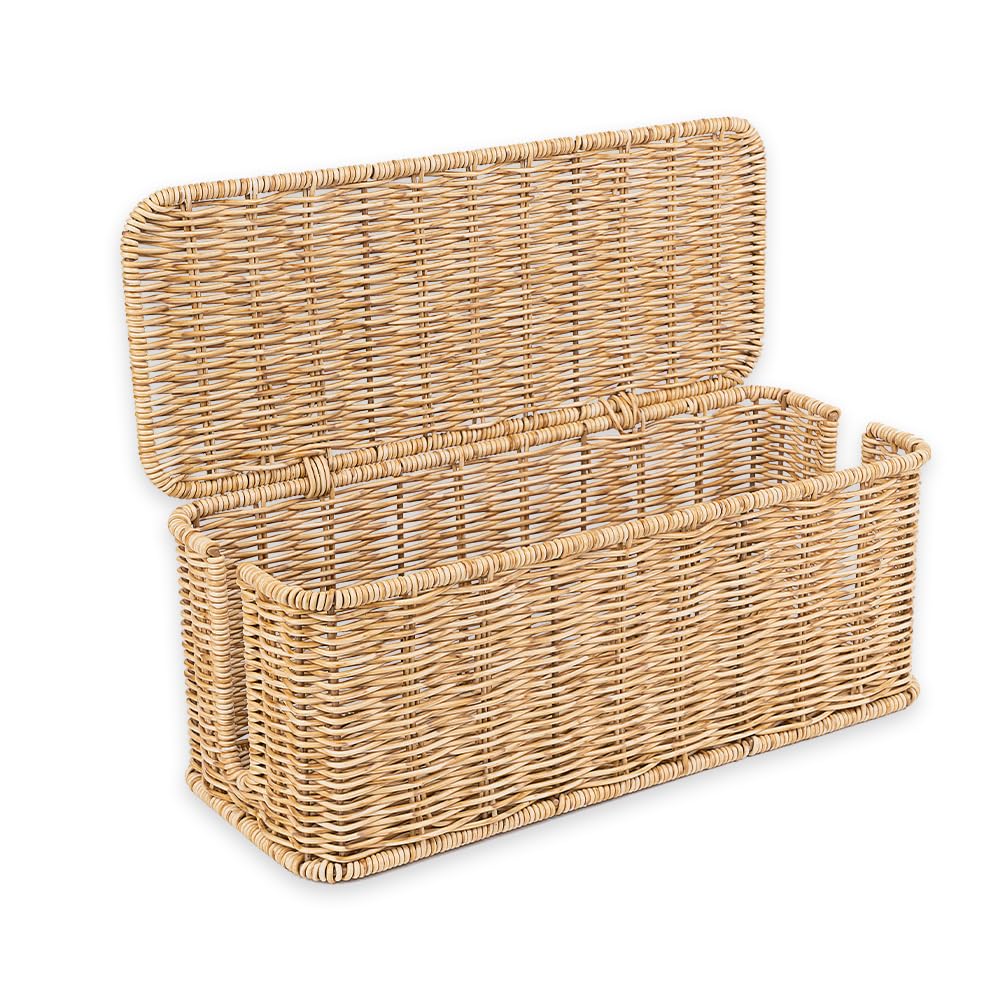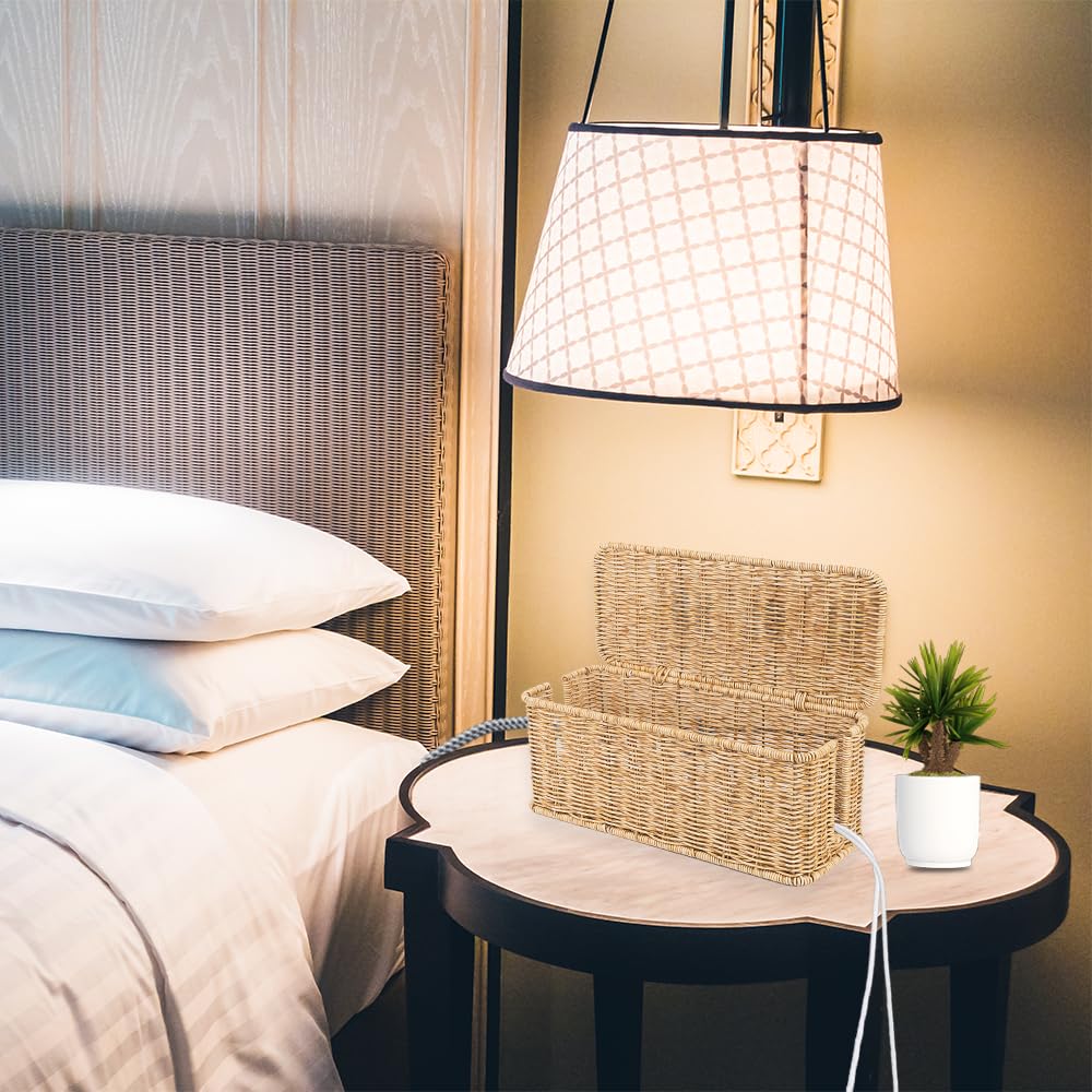 • Elegant & Safe Handwoven Synthetic Rattan: Our Cantalop Cord storage organizer with attached lid boasts a handmade polypropylene rattan like plastic, adding a touch of rustic elegance to any room. This cable organizer is carefully designed to hide wires and improve your space with a charming touch.