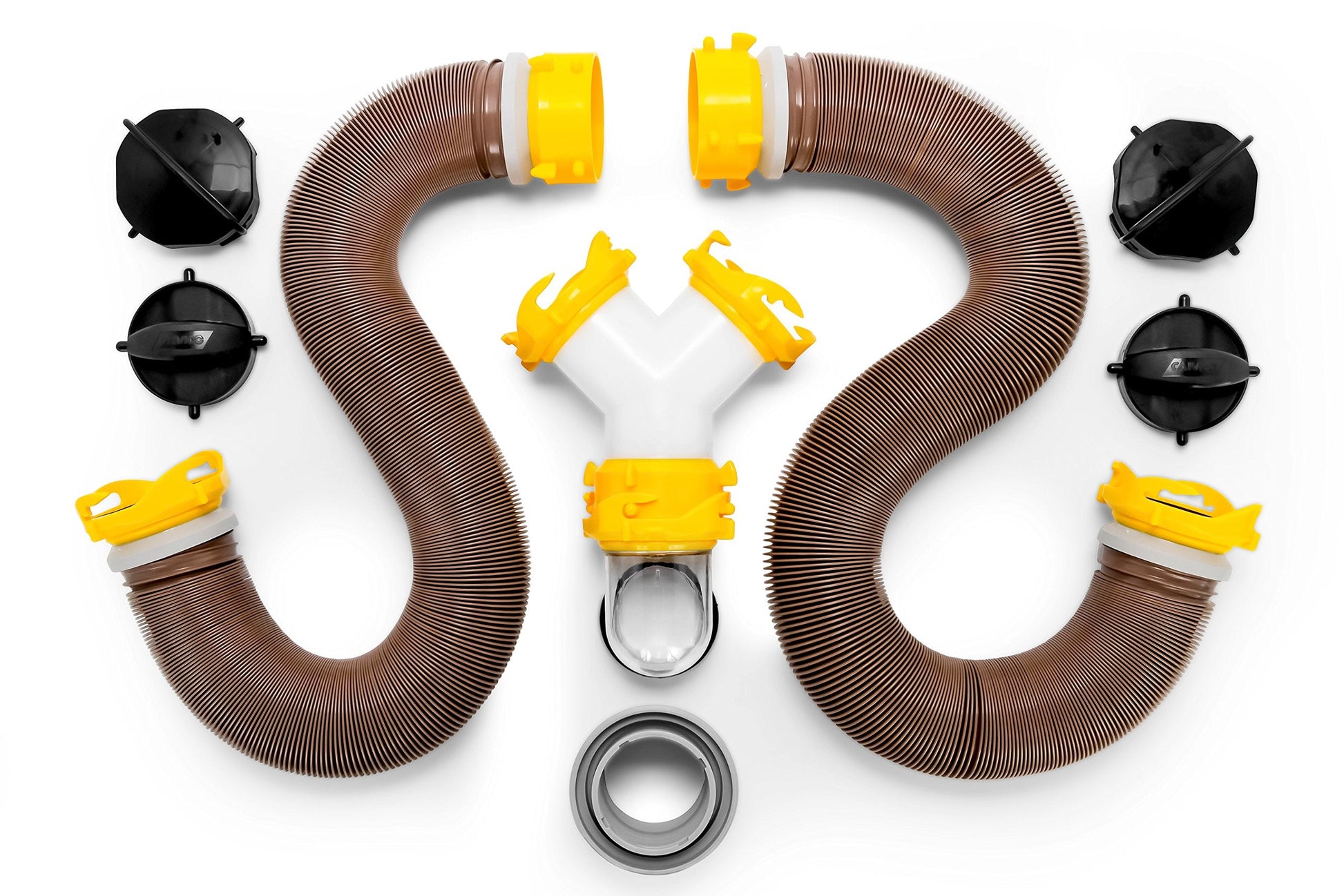 • All-Inclusive Camper Sewer Hose Kit: This RV dump hose kit includes (2) 10' 15mil HTS vinyl sewer hoses w/ pre-attached swivel fittings, (1) swivel clear bayonet elbow w/ 4-in-1 adapter, (1) translucent swivel wye fitting, & (4) storage end caps.