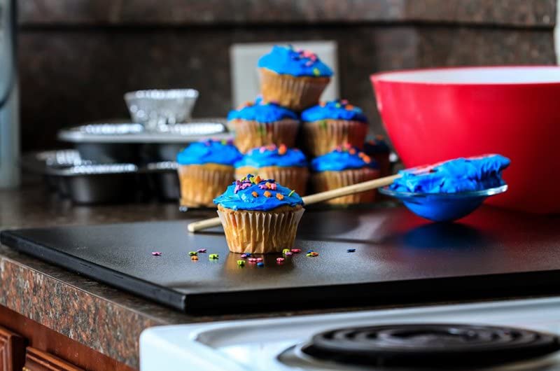 Details: Camco RV Black Decor Mate Stove Topper quiets stovetop rattle and adds much-needed counter space in your RV kitchen. Sits directly on stovetop grates or over an existing stove cover. Stays firmly in place with non-skid backing. Durable polyethylene—cleans easily with soap and water. Patented. (17' x 19-1/2' x 1/2').