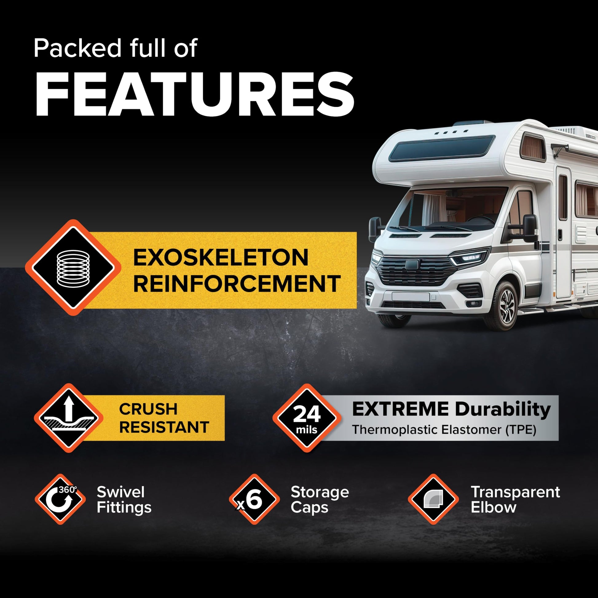 • Superior Abrasion-Resistant Exoskeleton: This super tough RV dump hose boasts a 24-mil thermoplastic elastomer construction w/a reinforced polymer core. It provides excellent abrasion resistance, crush protection, & is resistant to dents and rust.
