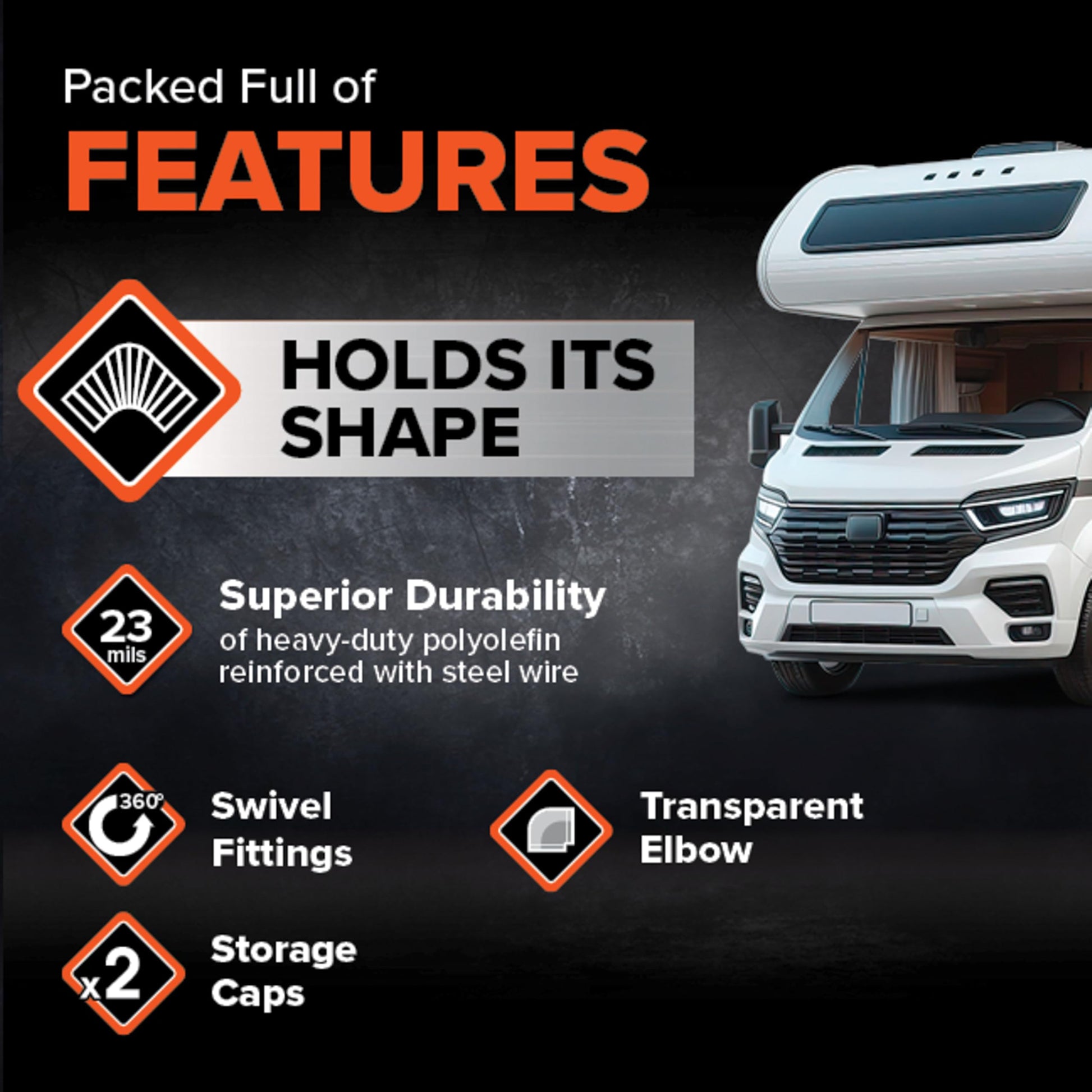 Rugged, Flexible Build: Constructed with 23 mils of durable polyolefin and reinforced with steel wire, the RhinoFLEX RV waste hose can bend and maintain its shape for reliable, long-lasting use.
