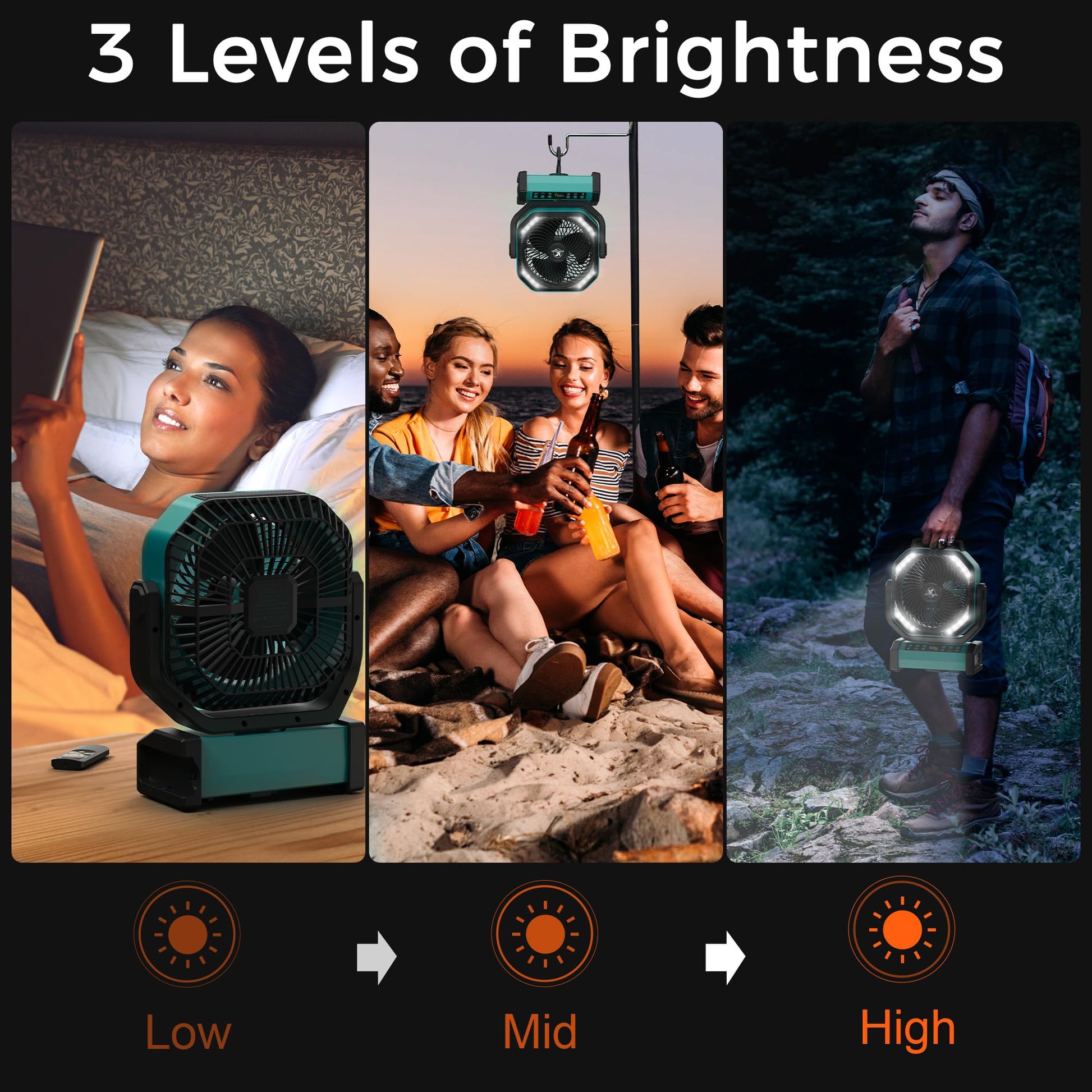 • Multi-functional Lighting: Featuring 16 ultra bright LED bulbs, the tent fan has 3 brightness settings, ranging from soft ambient light to a maximum of 400LM. Perfect for bedtime reading or illuminating outdoor at night, serving as an ideal light source for home or travel