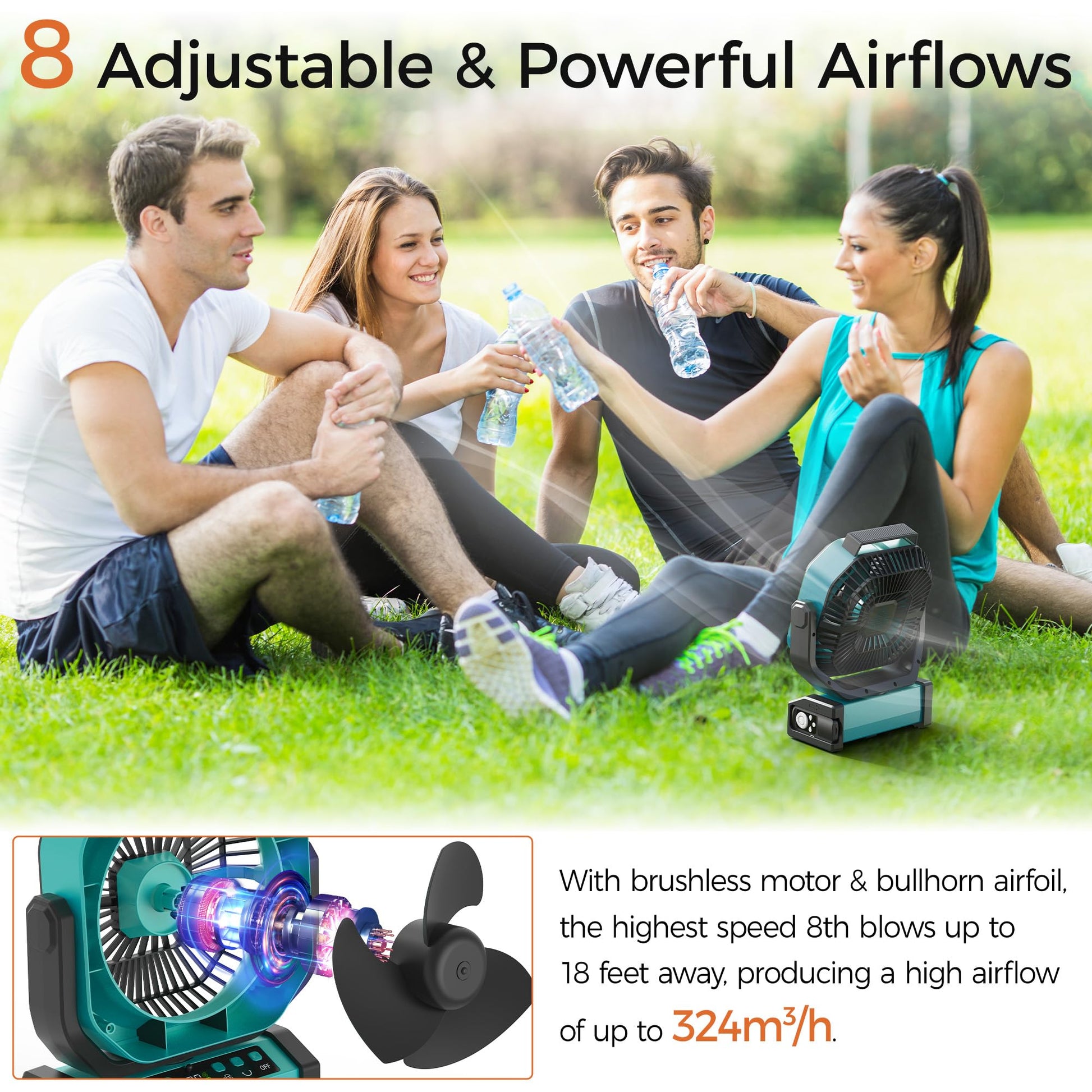 • Long-lasting Battery: The camping fan features a 20000mAh built-in battery with up to 112 hours of runtime on the lowest wind speed. Equipped with USB output ports for charging phones or other devices during power outages or outdoor adventures