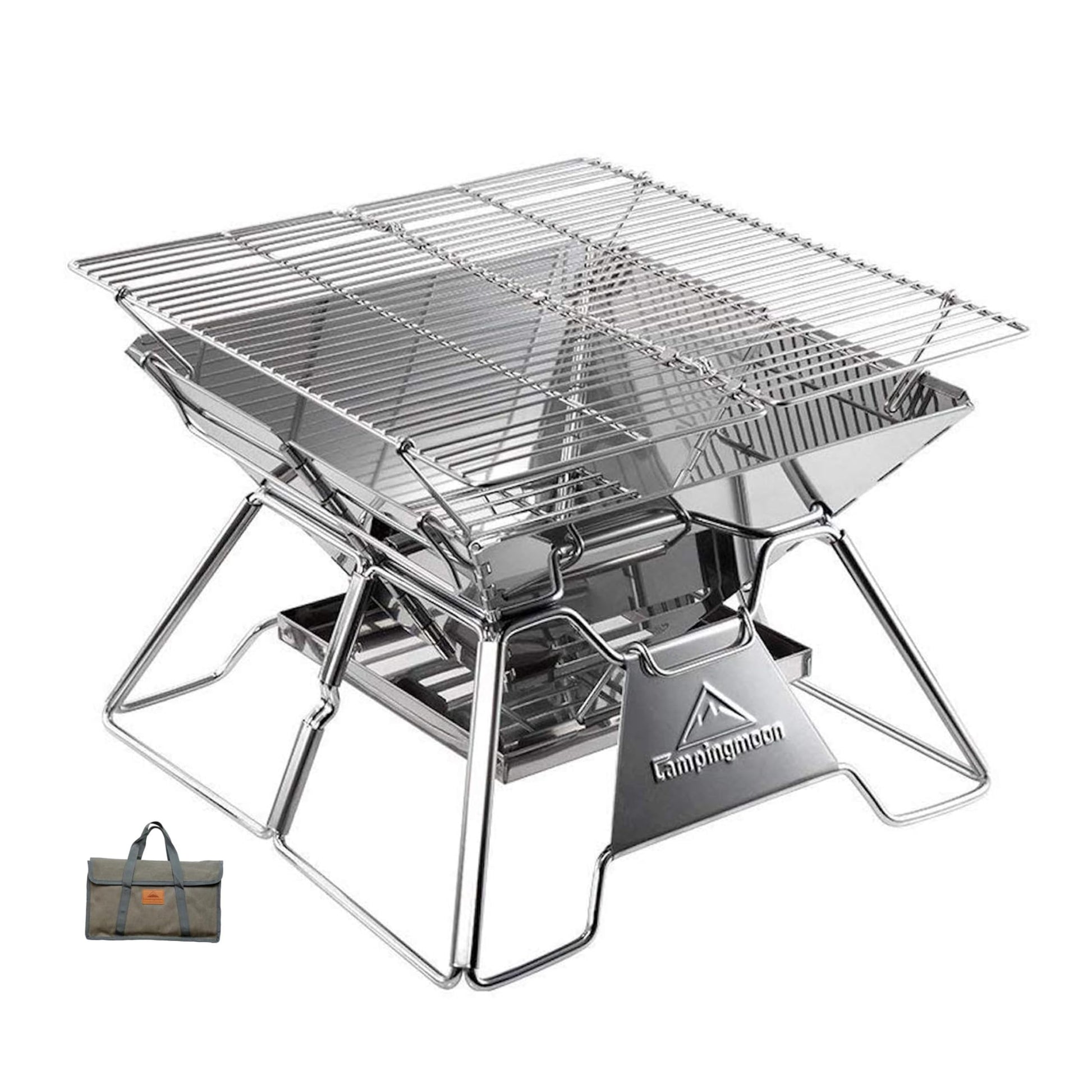 CAMPINGMOON Stainless Steel Foldable Camping Grills Portable Wood Burning Charcoal Grill 14-inch with Carrying Bag MT-2
