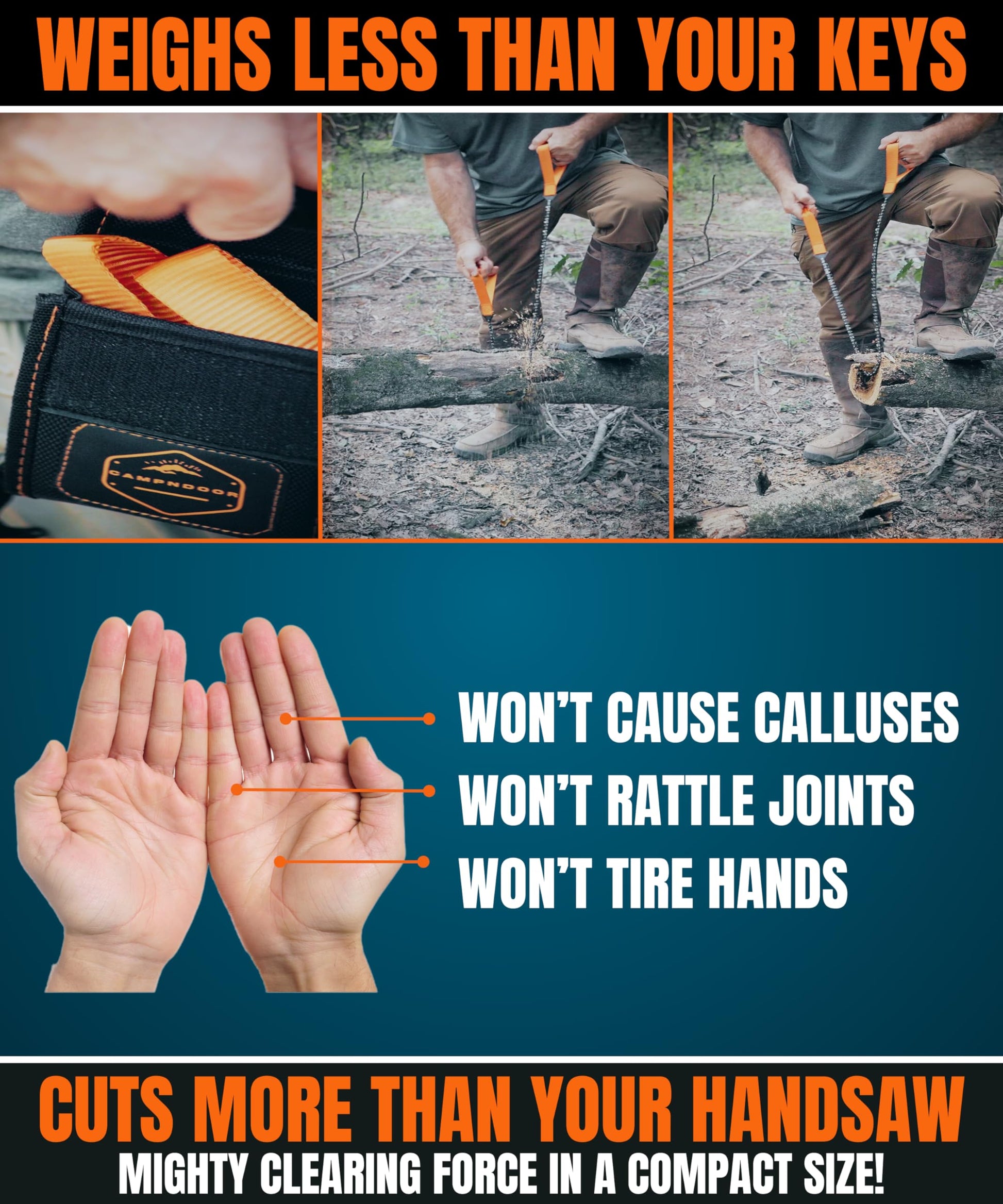 • THIS HAND SAW WON'T QUIT: 4000 Newtons testing on this 65Mn manual chainsaw means only a 988+ LB man could break it from misuse, making this camping accessory a powerful companion to the pocket knife, pocket saw survival, tree saw high limb, rope chain saw, bear spray, survival gear saw, army knife, fire starter, bushcraft saw, long rope chainsaw, chain hand saw for trees trimming and emergency food supply you keep inside your camping gear, hunting gear or outdoor gear backpacking survival kits.