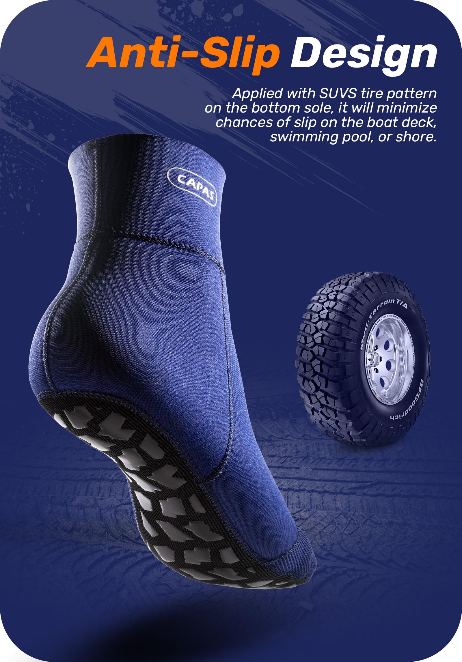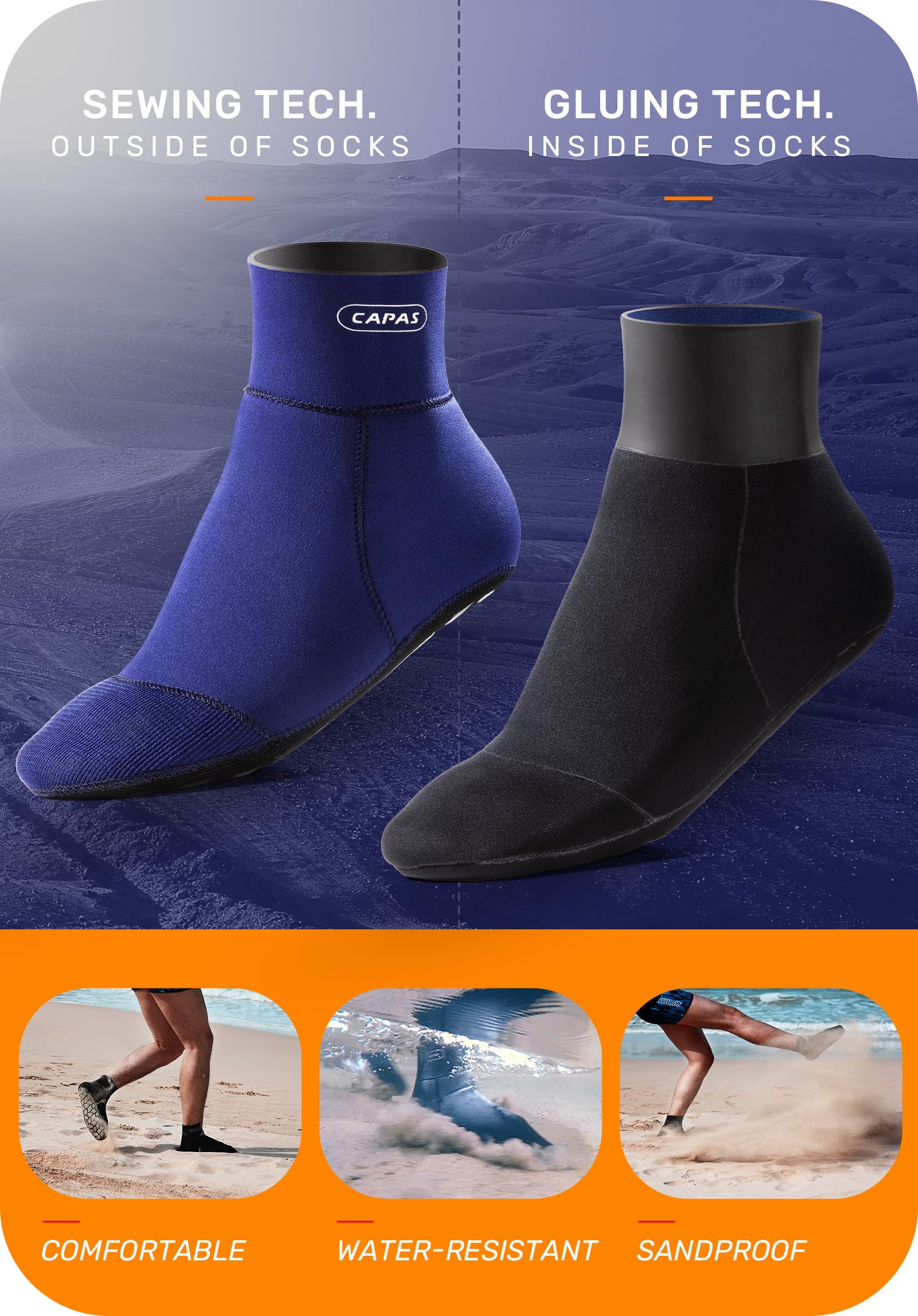 • 【Sand Proof for Beach Activities】Treated with Japanese-made professional-level Yamamoto #38 smooth skin material on the top, and applied with the Glued and Blind-stitched Techniques that sew the neoprene together without piercing the material, the CAPAS neoprene socks seal your feet snugly, eliminating any possibility for sands and micro powders going into the socks.