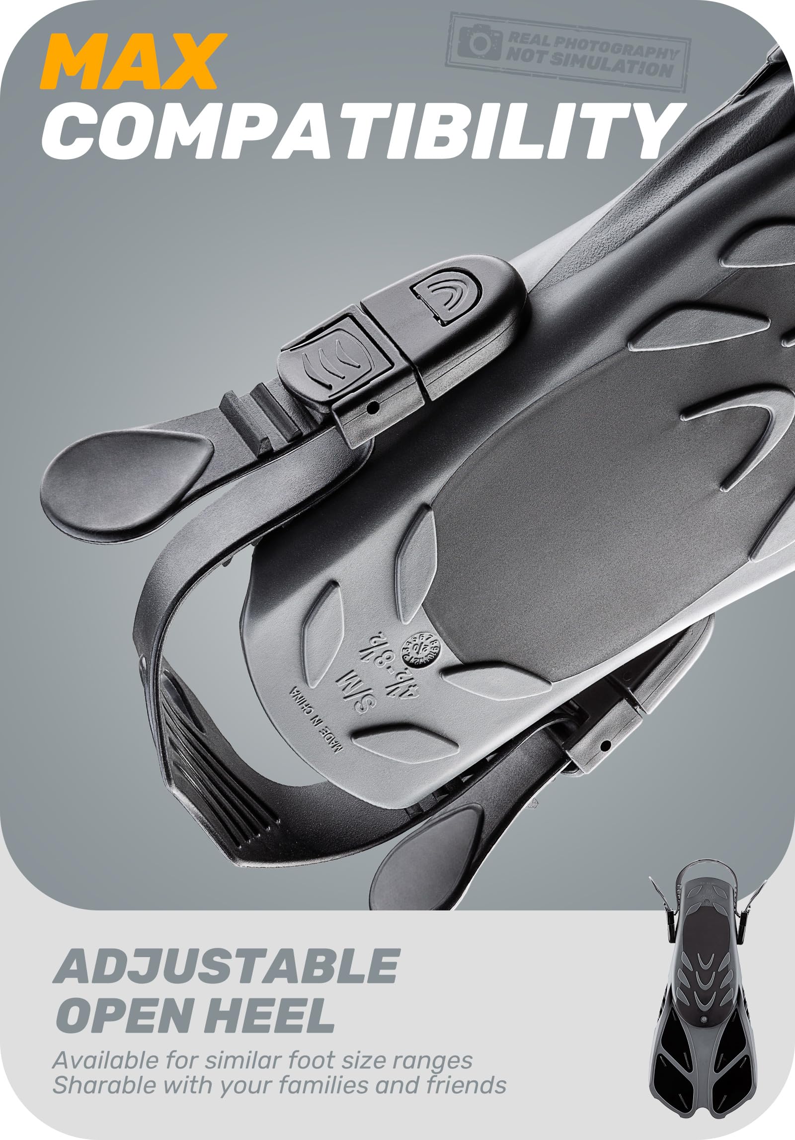 • Adjustable Open Heel Design, Good for Sharing - The open-heel design means each fin can accommodate a wider range of sizes, so family members or friends can share equipment more easily. The best parts is the filter pads inside the fins can keep fins in shape when store it.