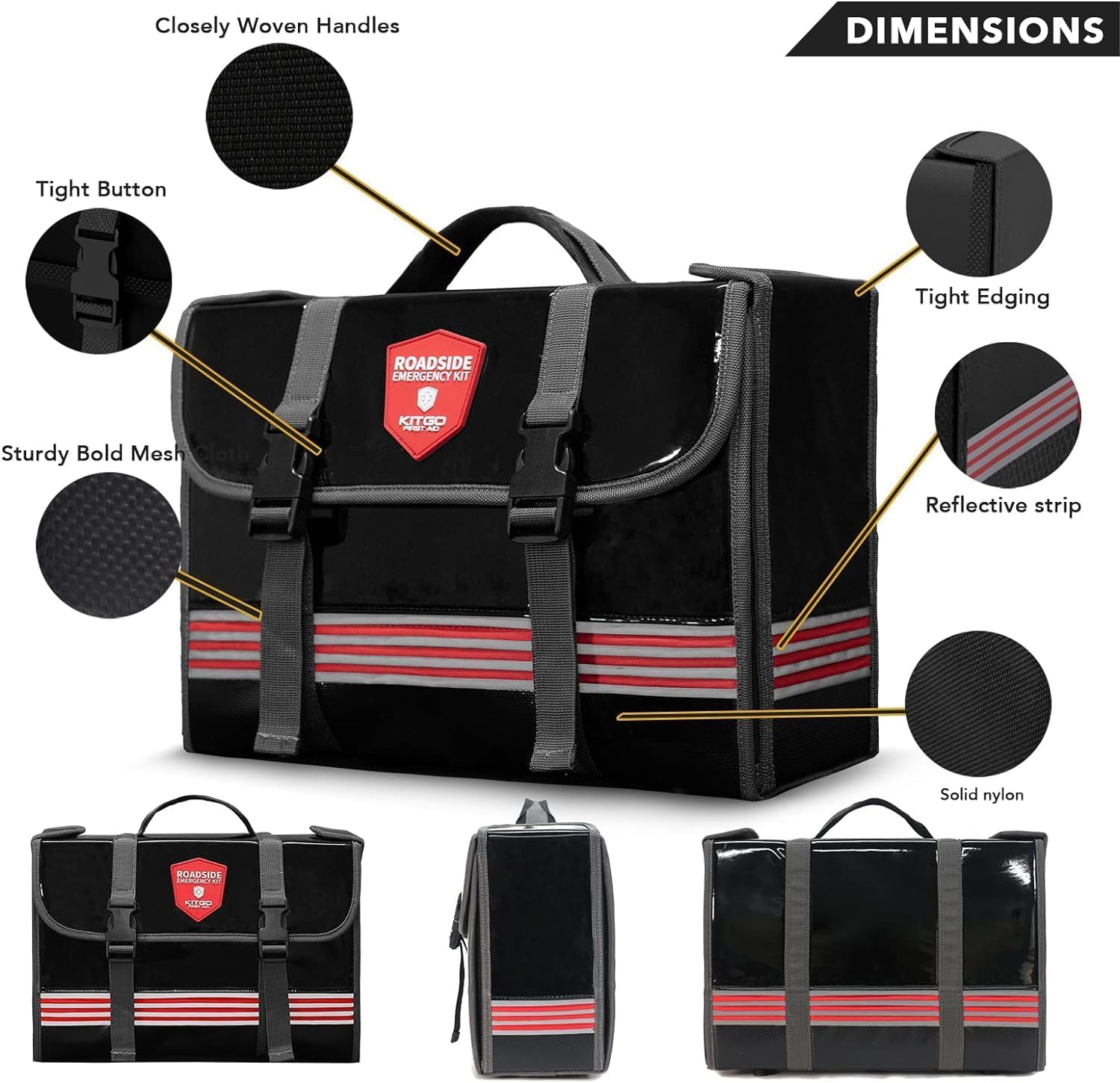 • Protect Your Safety On Road:We Provide This Compact And Practical Roadside Emergency Kit,Durable Tools That Are Designed For Top Performance And Lasting Quality.Includes Jumper Cables(9.8ft),Warning Triangle,Tire Repair Tools,Labor Gloves,Safety Hammer,Adhesive Tape,Tow Rope,Reflective Vest,Raincoat,Adjustable Wrench,Pliers,Flashlight,Whistle,Snow Shovel,LED Road Flares,Tire Pressure Gauge,Emergency Blanket And A First Aid Kit.