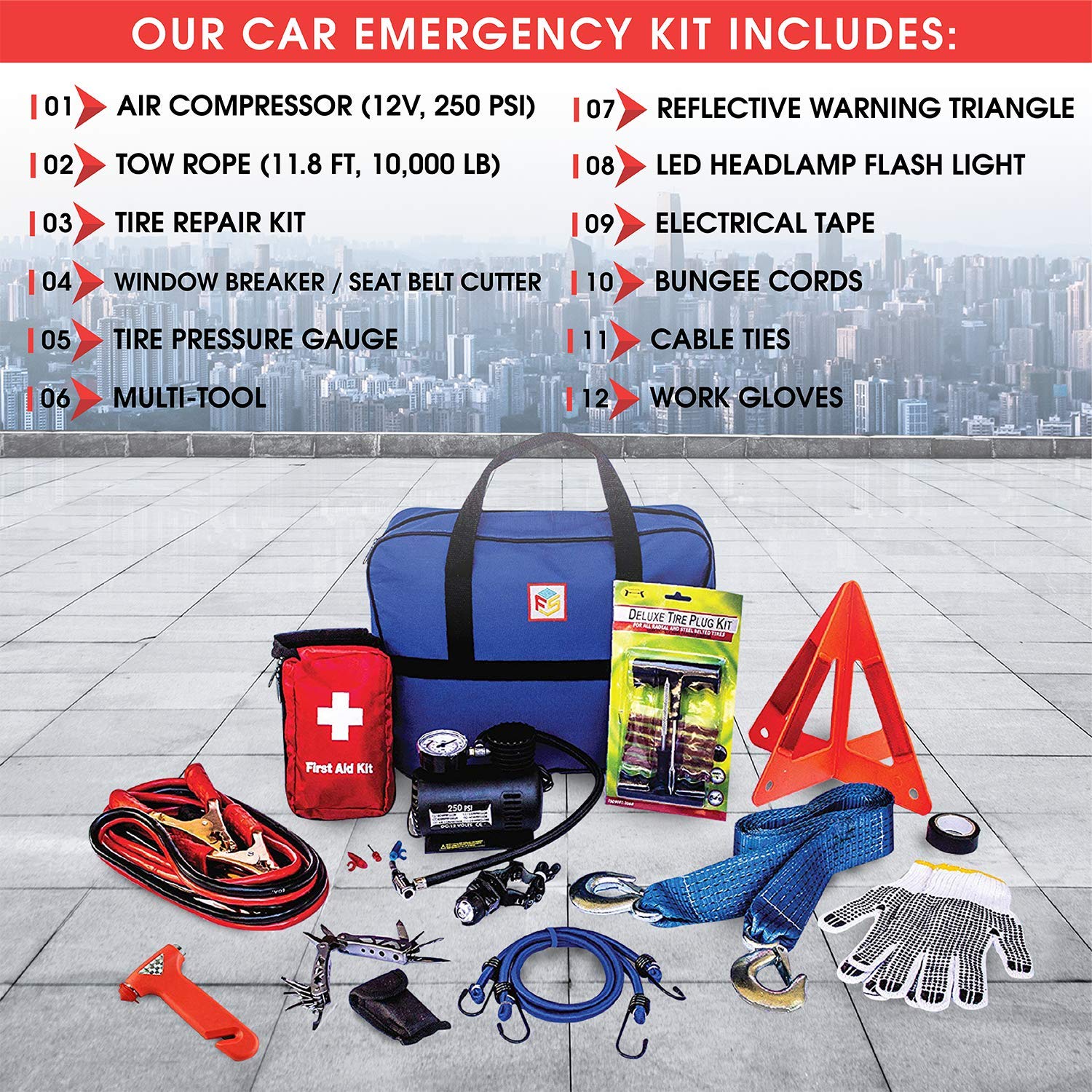 • Emergency Tools: Our roadside kit contains premium, essential tools needed for emergency situations, avoiding useless filler supplies found in other kits. Unique items include a 7-piece tire repair kit, a 10,000-lb tow rope, a window breaker, a portable air compressor, and a 10-ft jumper cable.